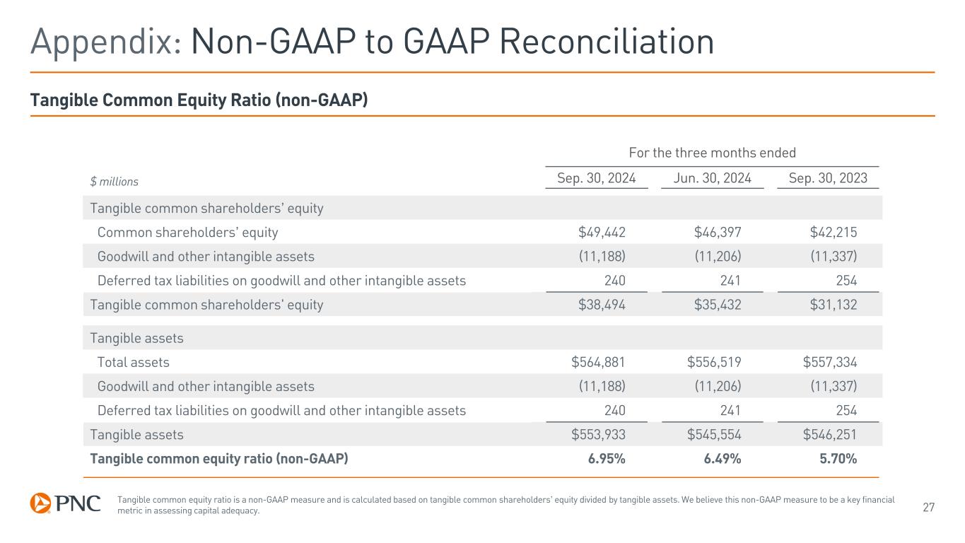 Appendix: Non-GAAP to GAAP Reconciliation 26 Tangible book value per common share is a non-GAAP measure and is calculated based on tangible common shareholders’ equity divided by period end common shares outstanding. We believe this non- GAAP measure serves as a useful tool to help evaluate the strength and discipline of a company's capital management strategies and as an additional, conservative measure of total company value. For the three months ended $ millions, except per share data Sep. 30, 2024 Jun. 30, 2024 Sep. 30, 2023 Book value per common share $124.56 $116.70 $105.98 Tangible book value per common share Common shareholders’ equity $49,442 $46,397 $42,215 Goodwill and other intangible assets (11,188) (11,206) (11,337) Deferred tax liabilities on goodwill and other intangible assets 240 241 254 Tangible common shareholders' equity $38,494 $35,432 $31,132 Period end common shares outstanding (in millions) 397 398 398 Tangible book value per common share (non-GAAP) $96.98 $89.12 $78.16 Tangible Book Value per Common Share (non-GAAP)