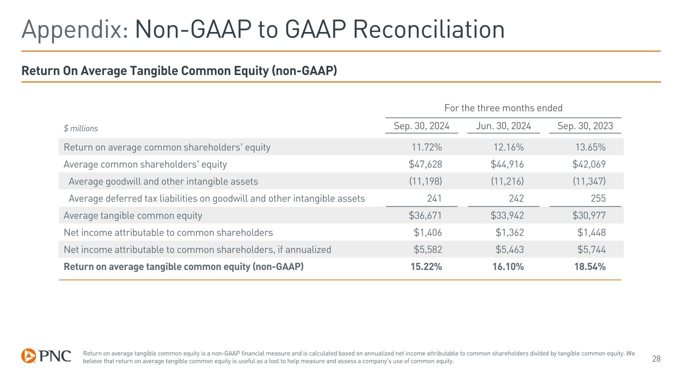 Appendix: Non-GAAP to GAAP Reconciliation 27 Tangible common equity ratio is a non-GAAP measure and is calculated based on tangible common shareholders’ equity divided by tangible assets. We believe this non-GAAP measure to be a key financial metric in assessing capital adequacy. For the three months ended $ millions Sep. 30, 2024 Jun. 30, 2024 Sep. 30, 2023 Tangible common shareholders’ equity Common shareholders’ equity $49,442 $46,397 $42,215 Goodwill and other intangible assets (11,188) (11,206) (11,337) Deferred tax liabilities on goodwill and other intangible assets 240 241 254 Tangible common shareholders' equity $38,494 $35,432 $31,132 Tangible assets Total assets $564,881 $556,519 $557,334 Goodwill and other intangible assets (11,188) (11,206) (11,337) Deferred tax liabilities on goodwill and other intangible assets 240 241 254 Tangible assets $553,933 $545,554 $546,251 Tangible common equity ratio (non-GAAP) 6.95% 6.49% 5.70% Tangible Common Equity Ratio (non-GAAP)