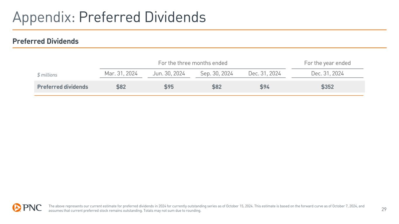 Appendix: Non-GAAP to GAAP Reconciliation 28 Return on average tangible common equity is a non-GAAP financial measure and is calculated based on annualized net income attributable to common shareholders divided by tangible common equity. We believe that return on average tangible common equity is useful as a tool to help measure and assess a company's use of common equity. For the three months ended $ millions Sep. 30, 2024 Jun. 30, 2024 Sep. 30, 2023 Return on average common shareholders’ equity 11.72% 12.16% 13.65% Average common shareholders’ equity $47,628 $44,916 $42,069 Average goodwill and other intangible assets (11,198) (11,216) (11,347) Average deferred tax liabilities on goodwill and other intangible assets 241 242 255 Average tangible common equity $36,671 $33,942 $30,977 Net income attributable to common shareholders $1,406 $1,362 $1,448 Net income attributable to common shareholders, if annualized $5,582 $5,463 $5,744 Return on average tangible common equity (non-GAAP) 15.22% 16.10% 18.54% Return On Average Tangible Common Equity (non-GAAP)