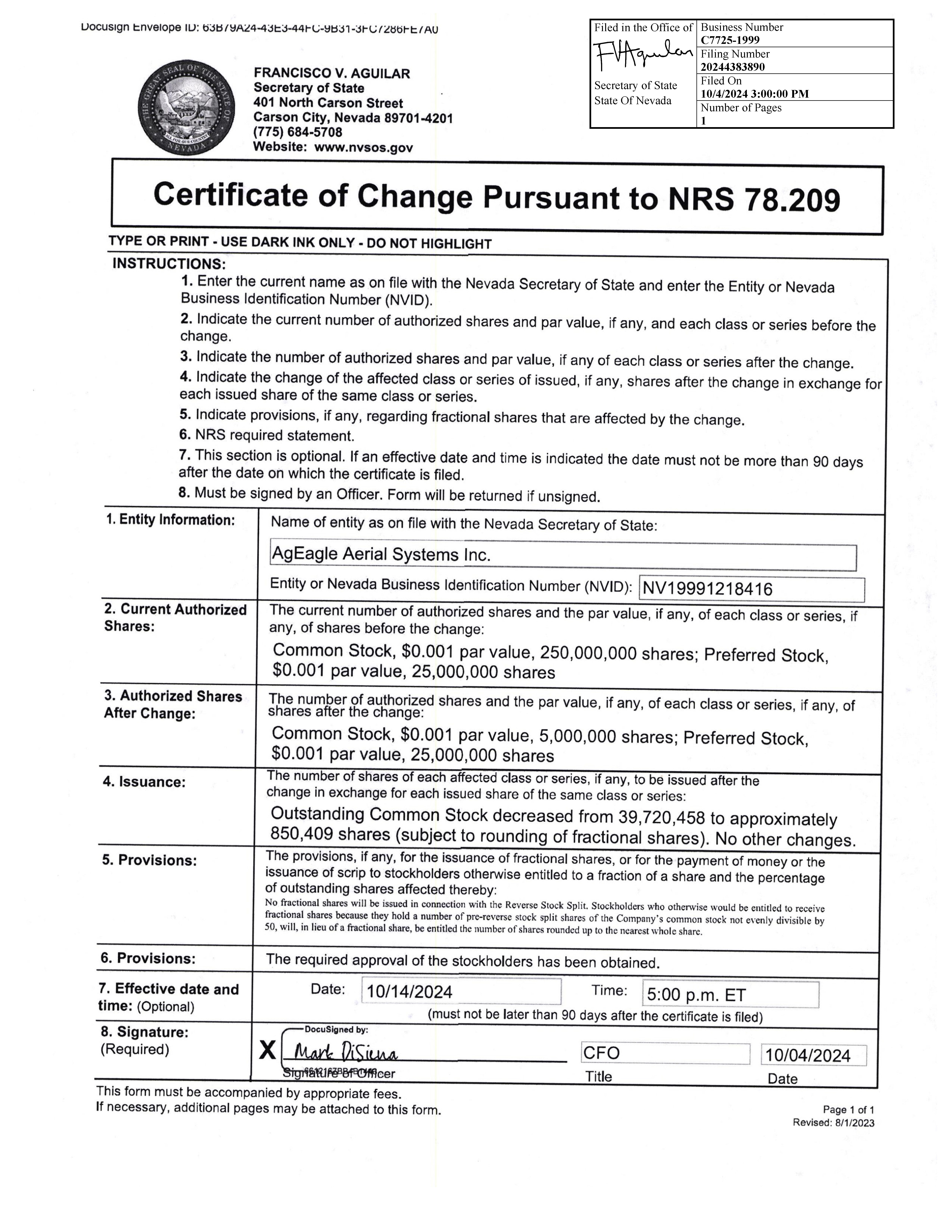 | Dated: October 15, 2024 | AGEAGLE AERIAL SYSTEMS INC. | |