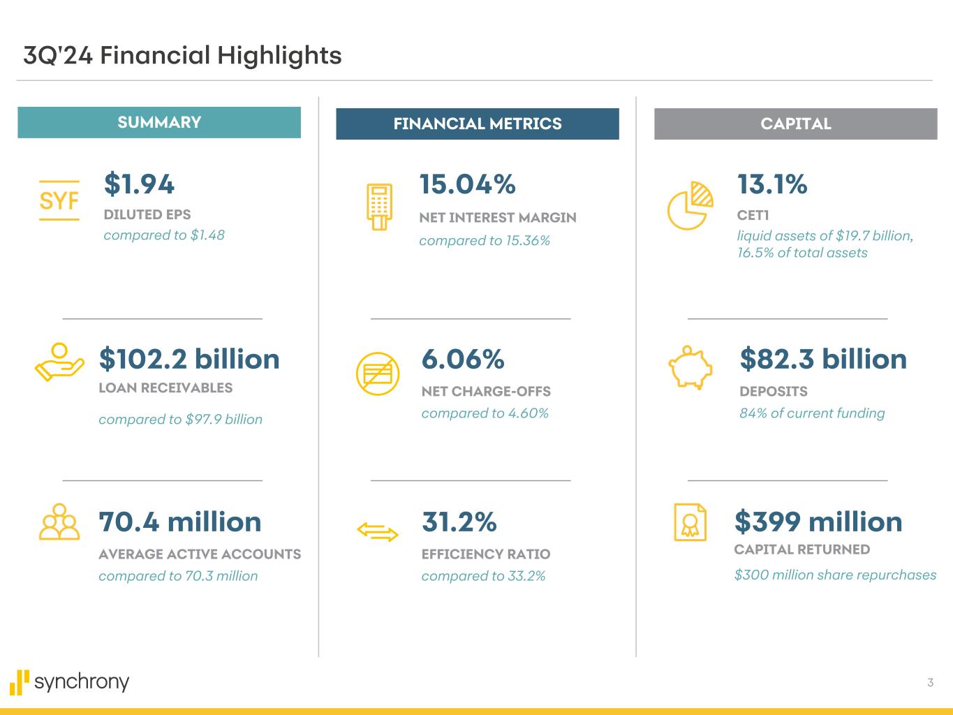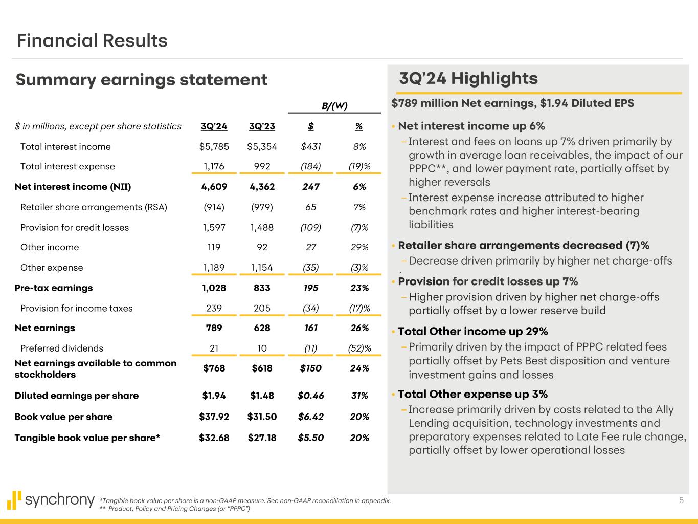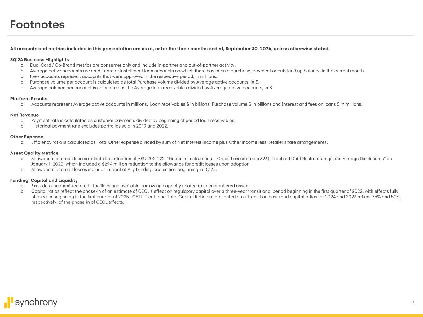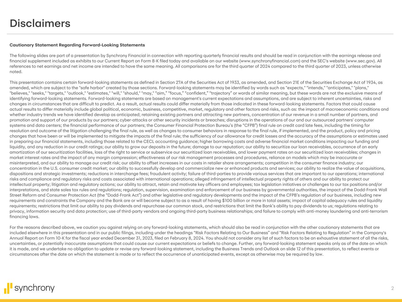 Investors should review the foregoing summary and discussion of Synchrony Financial's earnings and financial condition in conjunction with the detailed financial tables and information that follow, the Company’s Annual Report on Form 10-K for the fiscal year ended December 31, 2023, as filed February 8, 2024, and the Company’s forthcoming Quarterly Report on Form 10-Q for the quarter ended September 30, 2024. The detailed financial tables and other information are also available on the Investor Relations page of the Company’s website at www.investors.synchronyfinancial.com. This information is also furnished in a Current Report on Form 8-K filed with the SEC today. | |||||||||||||||||||||||