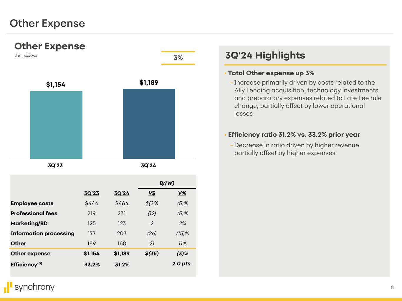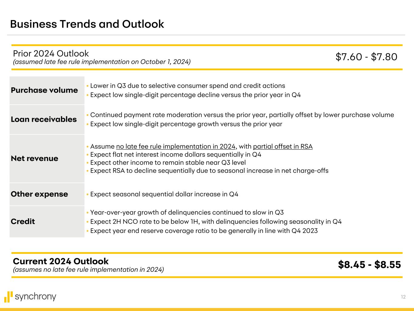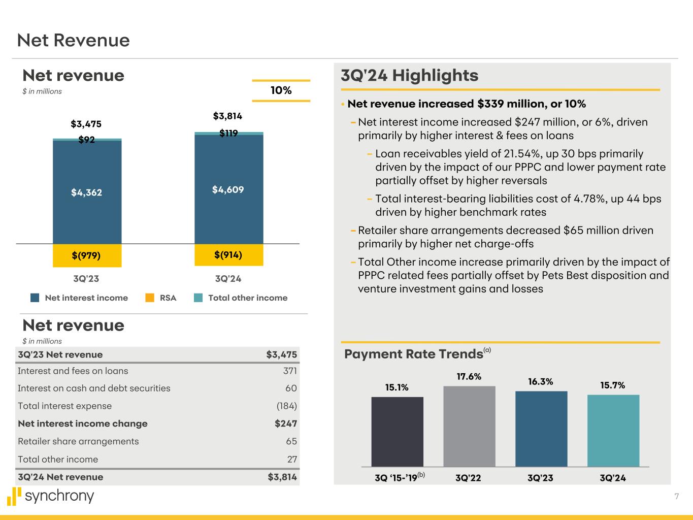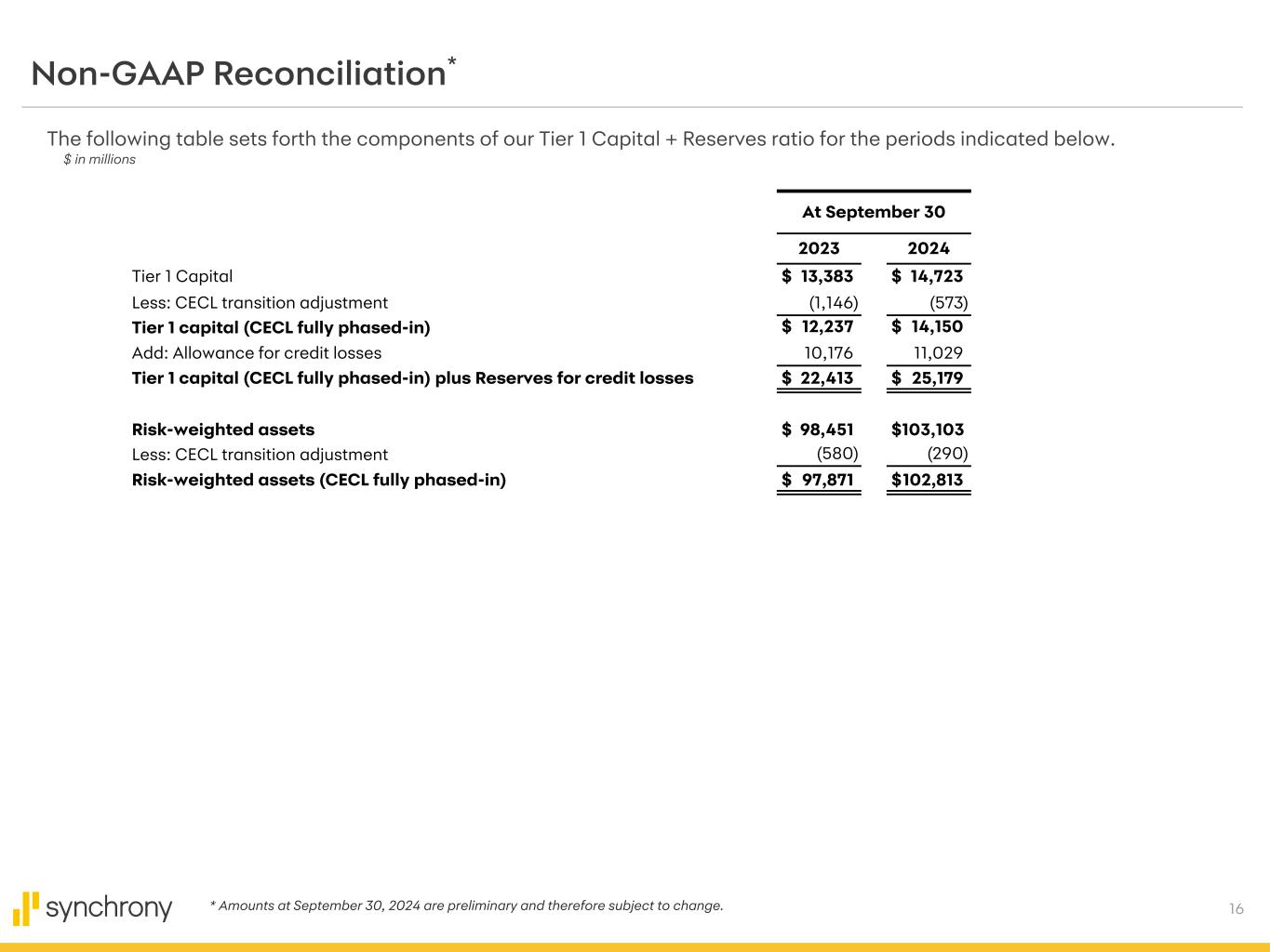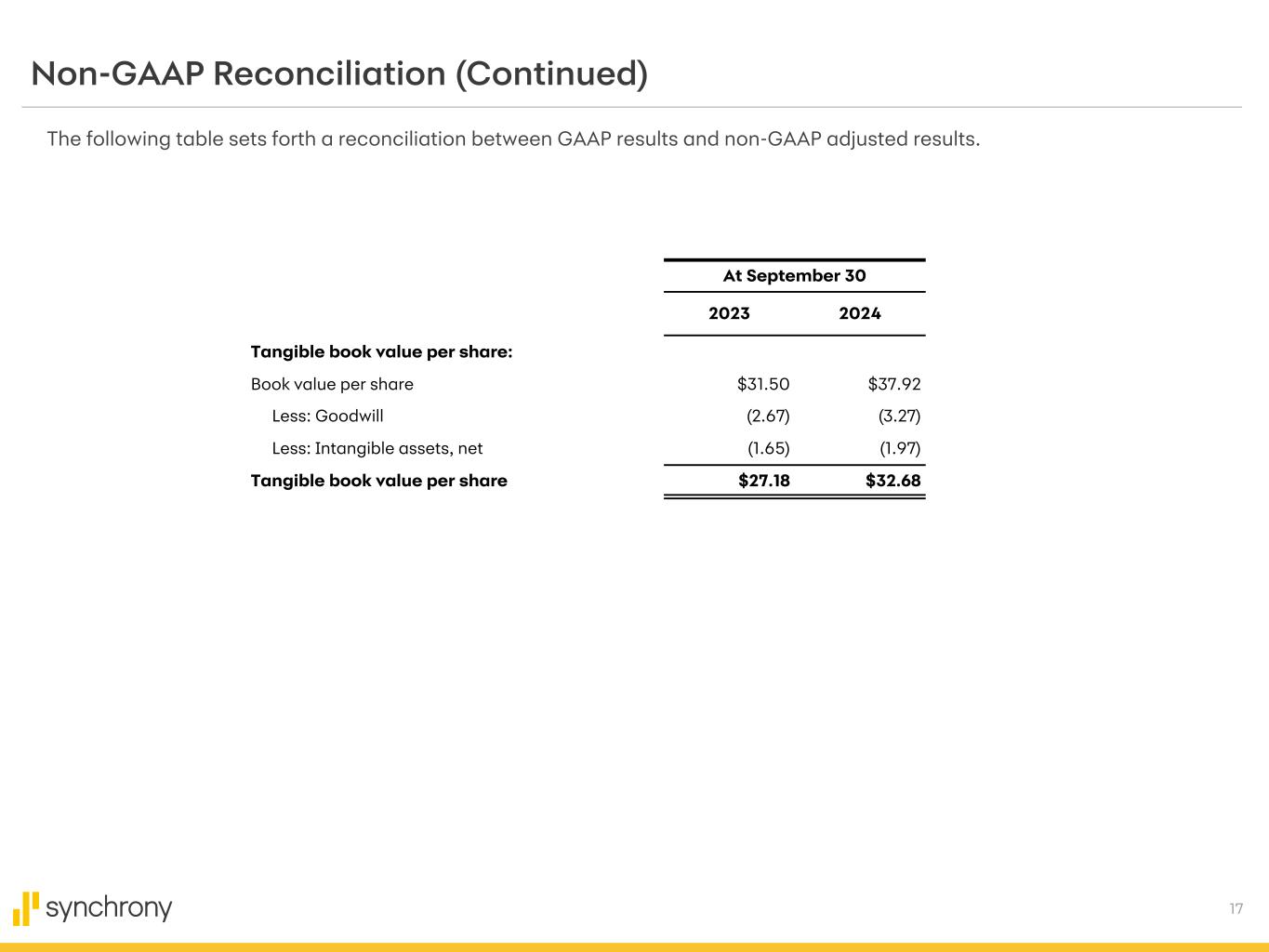 Investors should review the foregoing summary and discussion of Synchrony Financial's earnings and financial condition in conjunction with the detailed financial tables and information that follow, the Company’s Annual Report on Form 10-K for the fiscal year ended December 31, 2023, as filed February 8, 2024, and the Company’s forthcoming Quarterly Report on Form 10-Q for the quarter ended September 30, 2024. The detailed financial tables and other information are also available on the Investor Relations page of the Company’s website at www.investors.synchronyfinancial.com. This information is also furnished in a Current Report on Form 8-K filed with the SEC today. | |||||||||||||||||||||||