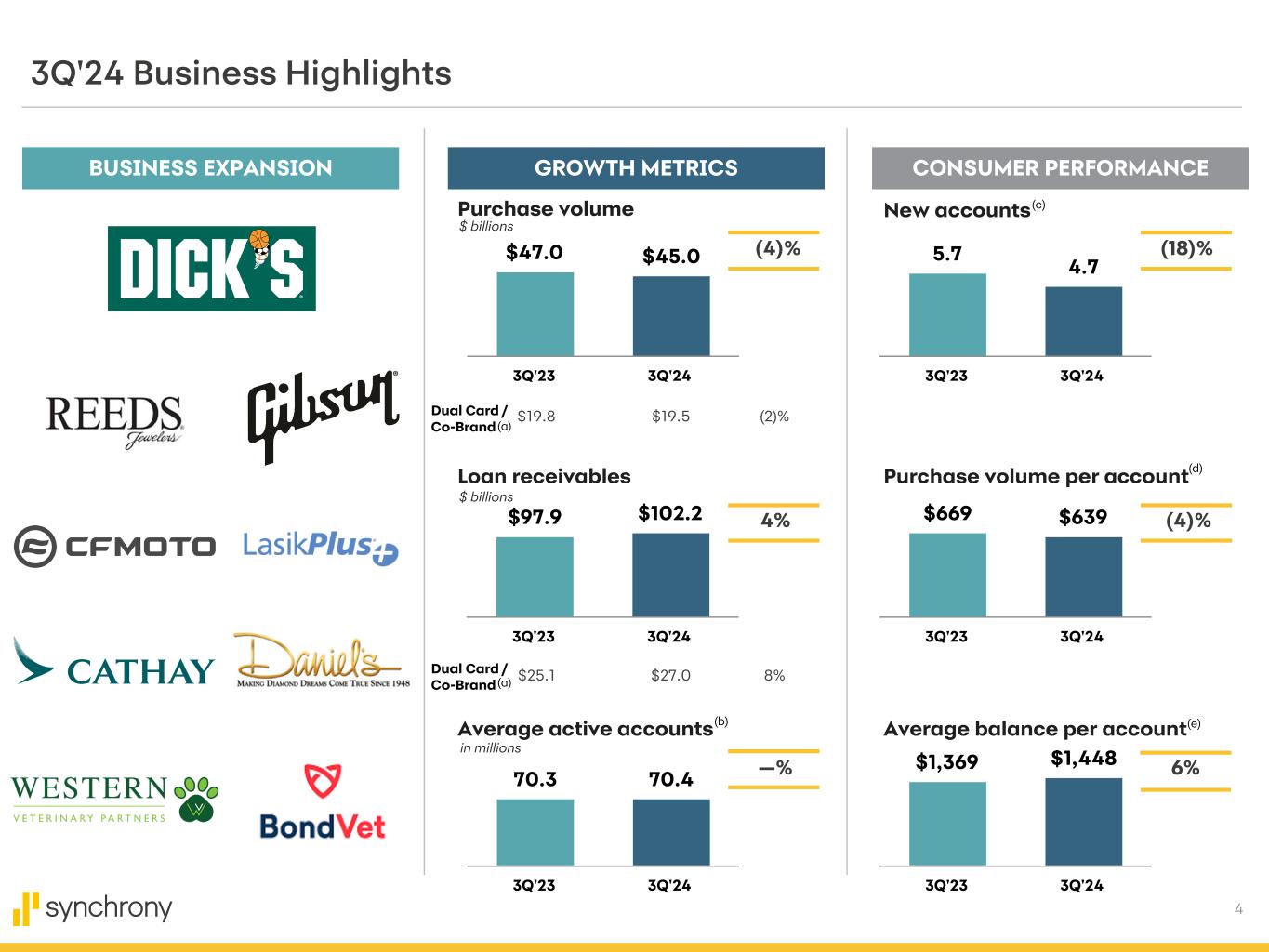 “Synchrony delivered another strong performance during the third quarter, demonstrating both the resilience of our differentiated business model and our ability to deliver consistently compelling outcomes for our stakeholders,” said Brian Wenzel, Synchrony’s Executive Vice President and Chief Financial Officer.” “While we continue to monitor consumer behavior and our portfolio performance closely, we are confident that the measures we’ve taken thus far to provide dynamic financial solutions to our customers – while also driving loyalty and sales for our partners – are driving progress toward our shared objectives. “The unique combination of Synchrony’s industry expertise, proprietary data and analytics, and innovative digital capabilities is powering our trajectory forward, and we believe we are well-positioned to drive sustainable and strong risk-adjusted returns over the long-term.” | ||||||||||||||||||||||||||