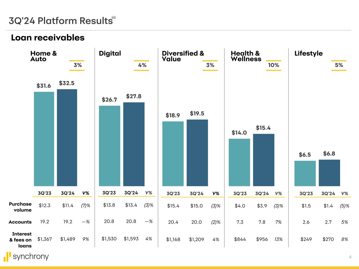 •Home & Auto purchase volume decreased 7%, as the impact of the Ally Lending acquisition was more than offset by a combination of lower consumer traffic, fewer large ticket purchases, and the impact of credit actions. Period-end loan receivables increased 3%, reflecting the impacts of the Ally Lending acquisition and lower payment rates. Interest and fees on loans were up 9%, primarily driven by higher average loan receivables and higher benchmark rates. Average active accounts remained flat. •Digital purchase volume decreased 3%, driven by lower spend per account and the impact of credit actions. Period-end loan receivables increased 4%, driven primarily by lower payment rates. Interest and fees on loans increased 4%, reflecting the impacts of higher average loan receivables, lower payment rates, and higher benchmark rates. Average active accounts remained flat. •Diversified & Value purchase volume decreased 3%, driven by lower spend per account and the impact of credit actions. Period-end loan receivables increased 3%, driven primarily by lower payment rates. Interest and fees on loans increased 4%, driven by the impacts of higher average loan receivables, lower payment rates, and higher benchmark rates. Average active accounts decreased 2%. •Health & Wellness purchase volume decreased 3%, as lower spend in Dental, Cosmetic, and Vision, combined with the impact of credit actions, was partially offset by growth in Pet and Audiology. Period-end loan receivables increased 10%, driven by continued higher purchase volume over the last 12 months and lower payment rates. Interest and fees on loans increased 13%, reflecting the impacts of higher average loan receivables. Average active accounts increased 7%. •Lifestyle purchase volume decreased 5%, driven by lower transaction values and the impact of credit actions. Period-end loan receivables increased 5%, reflecting payment rate moderation. Interest and fees on loans increased 8%, driven by the impacts of higher average loan receivables and higher benchmark rates. Average active accounts increased 5%. | |||||||||||||||||||||||
