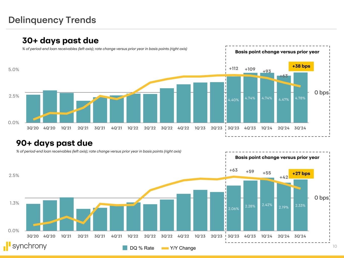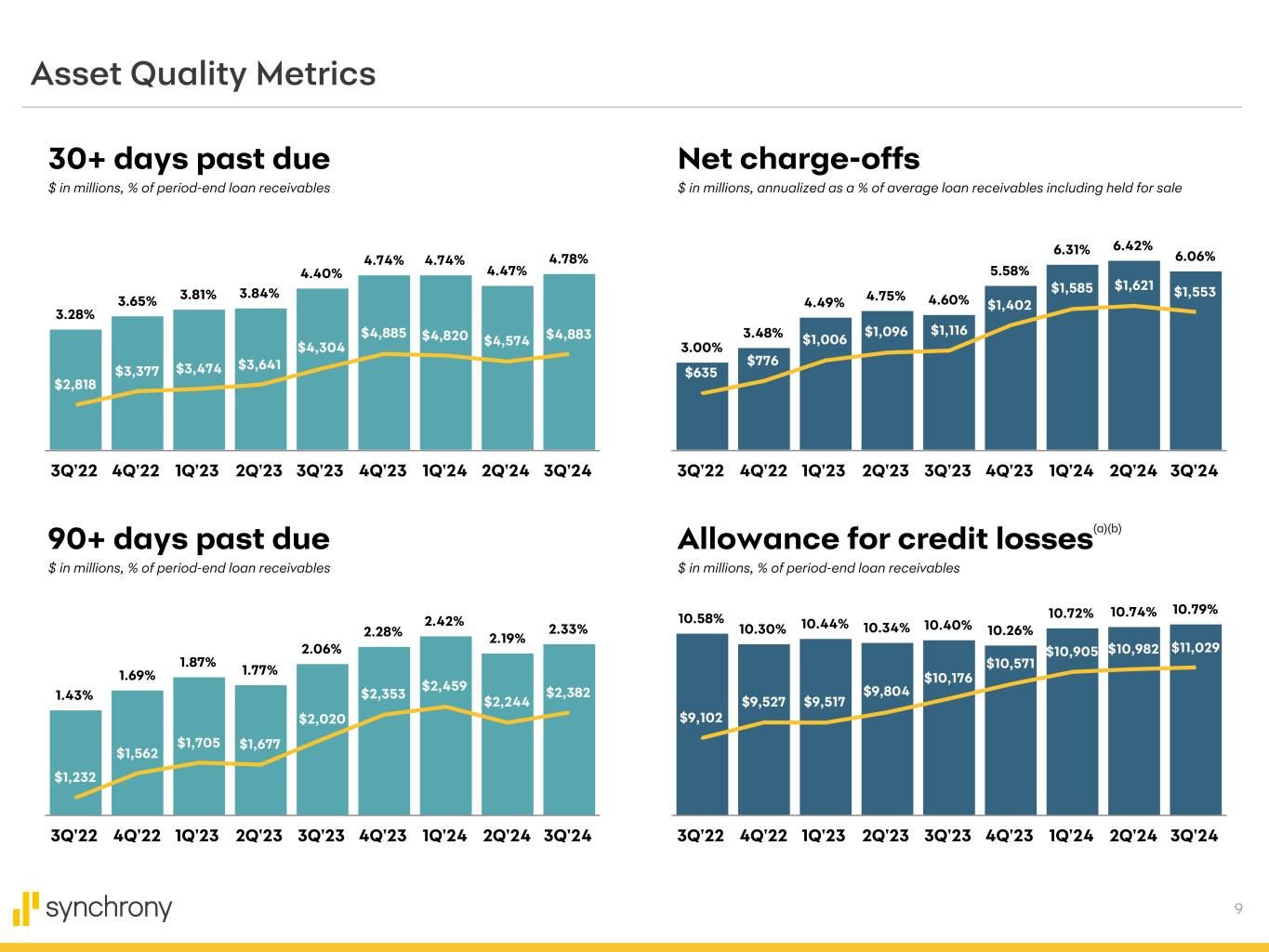 •Loans 30+ days past due as a percentage of total period-end loan receivables were 4.78% compared to 4.40% in the prior year, an increase of 38 basis points and approximately 16 basis points above the average of the third quarters in 2017 through 2019. •Net charge-offs as a percentage of total average loan receivables were 6.06% compared to 4.60% in the prior year, an increase of 146 basis points, and 97 basis points above the average of the third quarters in 2017 through 2019. •The allowance for credit losses as a percentage of total period-end loan receivables was 10.79%, compared to 10.74% in the second quarter 2024. | ||||||||||||||||||||||||||