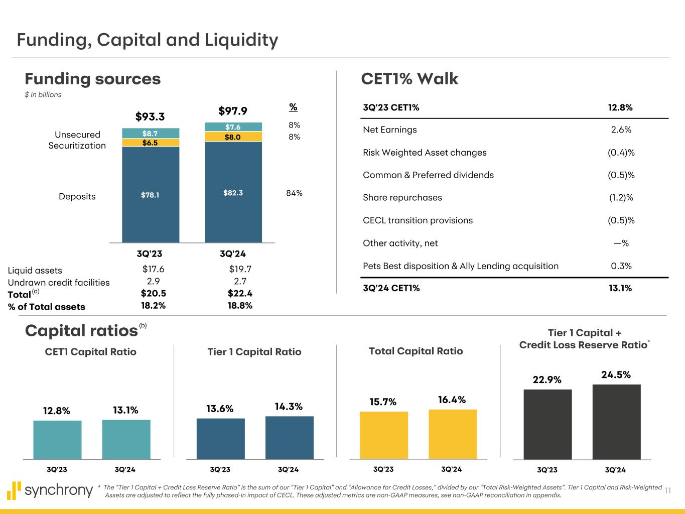 •Loan receivables of $102.2 billion increased 4%; purchase volume decreased 4% and average active accounts remained flat. •Deposits increased $4.2 billion, or 5%, to $82.3 billion and comprised 84% of funding. •Total liquid assets and undrawn credit facilities were $22.4 billion, or 18.8% of total assets. •The company returned $399 million in capital to shareholders, including $300 million of share repurchases and $99 million of common stock dividends. •As of September 30, 2024 the Company had a total remaining share repurchase authorization of $700 million. •The estimated Common Equity Tier 1 ratio was 13.1% compared to 12.8%, and the estimated Tier 1 Capital ratio was 14.3% compared to 13.6% in the prior year. | |||||||||||||||||||||||