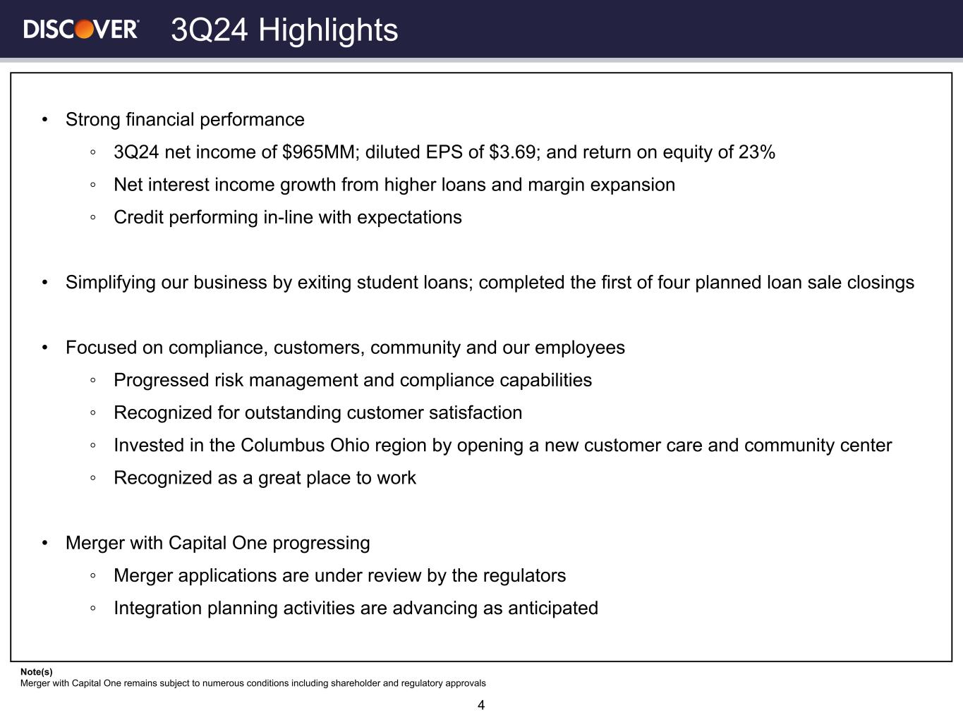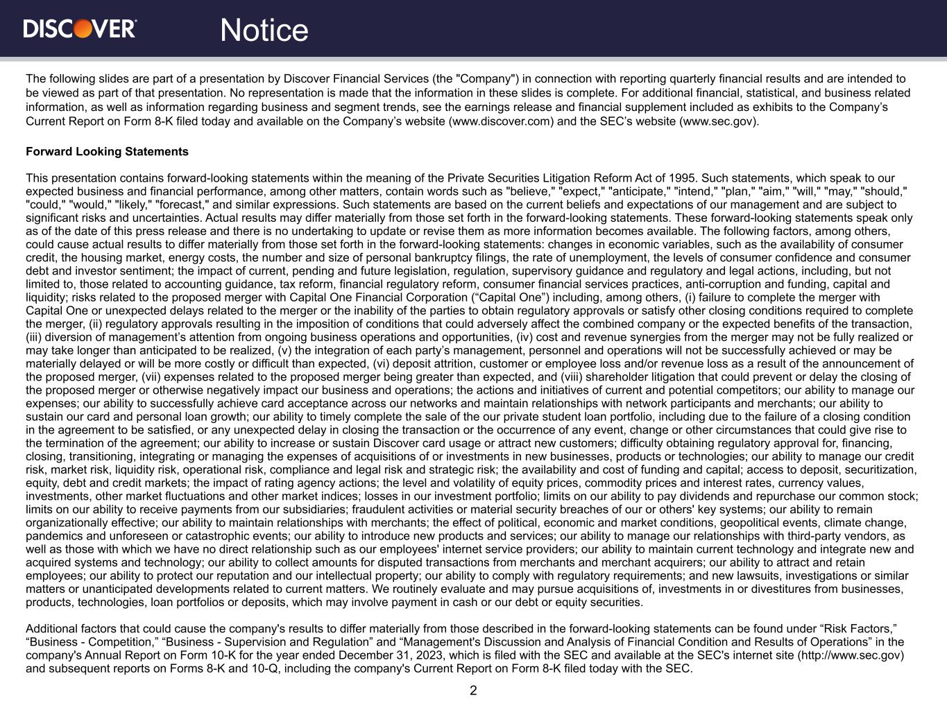 The following slides are part of a presentation by Discover Financial Services (the "Company") in connection with reporting quarterly financial results and are intended to be viewed as part of that presentation. No representation is made that the information in these slides is complete. For additional financial, statistical, and business related information, as well as information regarding business and segment trends, see the earnings release and financial supplement included as exhibits to the Company’s Current Report on Form 8-K filed today and available on the Company’s website (www.discover.com) and the SEC’s website (www.sec.gov). Forward Looking Statements This presentation contains forward-looking statements within the meaning of the Private Securities Litigation Reform Act of 1995. Such statements, which speak to our expected business and financial performance, among other matters, contain words such as "believe," "expect," "anticipate," "intend," "plan," "aim," "will," "may," "should," "could," "would," "likely," "forecast," and similar expressions. Such statements are based on the current beliefs and expectations of our management and are subject to significant risks and uncertainties. Actual results may differ materially from those set forth in the forward-looking statements. These forward-looking statements speak only as of the date of this press release and there is no undertaking to update or revise them as more information becomes available. The following factors, among others, could cause actual results to differ materially from those set forth in the forward-looking statements: changes in economic variables, such as the availability of consumer credit, the housing market, energy costs, the number and size of personal bankruptcy filings, the rate of unemployment, the levels of consumer confidence and consumer debt and investor sentiment; the impact of current, pending and future legislation, regulation, supervisory guidance and regulatory and legal actions, including, but not limited to, those related to accounting guidance, tax reform, financial regulatory reform, consumer financial services practices, anti-corruption and funding, capital and liquidity; risks related to the proposed merger with Capital One Financial Corporation (“Capital One”) including, among others, (i) failure to complete the merger with Capital One or unexpected delays related to the merger or the inability of the parties to obtain regulatory approvals or satisfy other closing conditions required to complete the merger, (ii) regulatory approvals resulting in the imposition of conditions that could adversely affect the combined company or the expected benefits of the transaction, (iii) diversion of management’s attention from ongoing business operations and opportunities, (iv) cost and revenue synergies from the merger may not be fully realized or may take longer than anticipated to be realized, (v) the integration of each party’s management, personnel and operations will not be successfully achieved or may be materially delayed or will be more costly or difficult than expected, (vi) deposit attrition, customer or employee loss and/or revenue loss as a result of the announcement of the proposed merger, (vii) expenses related to the proposed merger being greater than expected, and (viii) shareholder litigation that could prevent or delay the closing of the proposed merger or otherwise negatively impact our business and operations; the actions and initiatives of current and potential competitors; our ability to manage our expenses; our ability to successfully achieve card acceptance across our networks and maintain relationships with network participants and merchants; our ability to sustain our card and personal loan growth; our ability to timely complete the sale of the our private student loan portfolio, including due to the failure of a closing condition in the agreement to be satisfied, or any unexpected delay in closing the transaction or the occurrence of any event, change or other circumstances that could give rise to the termination of the agreement; our ability to increase or sustain Discover card usage or attract new customers; difficulty obtaining regulatory approval for, financing, closing, transitioning, integrating or managing the expenses of acquisitions of or investments in new businesses, products or technologies; our ability to manage our credit risk, market risk, liquidity risk, operational risk, compliance and legal risk and strategic risk; the availability and cost of funding and capital; access to deposit, securitization, equity, debt and credit markets; the impact of rating agency actions; the level and volatility of equity prices, commodity prices and interest rates, currency values, investments, other market fluctuations and other market indices; losses in our investment portfolio; limits on our ability to pay dividends and repurchase our common stock; limits on our ability to receive payments from our subsidiaries; fraudulent activities or material security breaches of our or others' key systems; our ability to remain organizationally effective; our ability to maintain relationships with merchants; the effect of political, economic and market conditions, geopolitical events, climate change, pandemics and unforeseen or catastrophic events; our ability to introduce new products and services; our ability to manage our relationships with third-party vendors, as well as those with which we have no direct relationship such as our employees' internet service providers; our ability to maintain current technology and integrate new and acquired systems and technology; our ability to collect amounts for disputed transactions from merchants and merchant acquirers; our ability to attract and retain employees; our ability to protect our reputation and our intellectual property; our ability to comply with regulatory requirements; and new lawsuits, investigations or similar mat