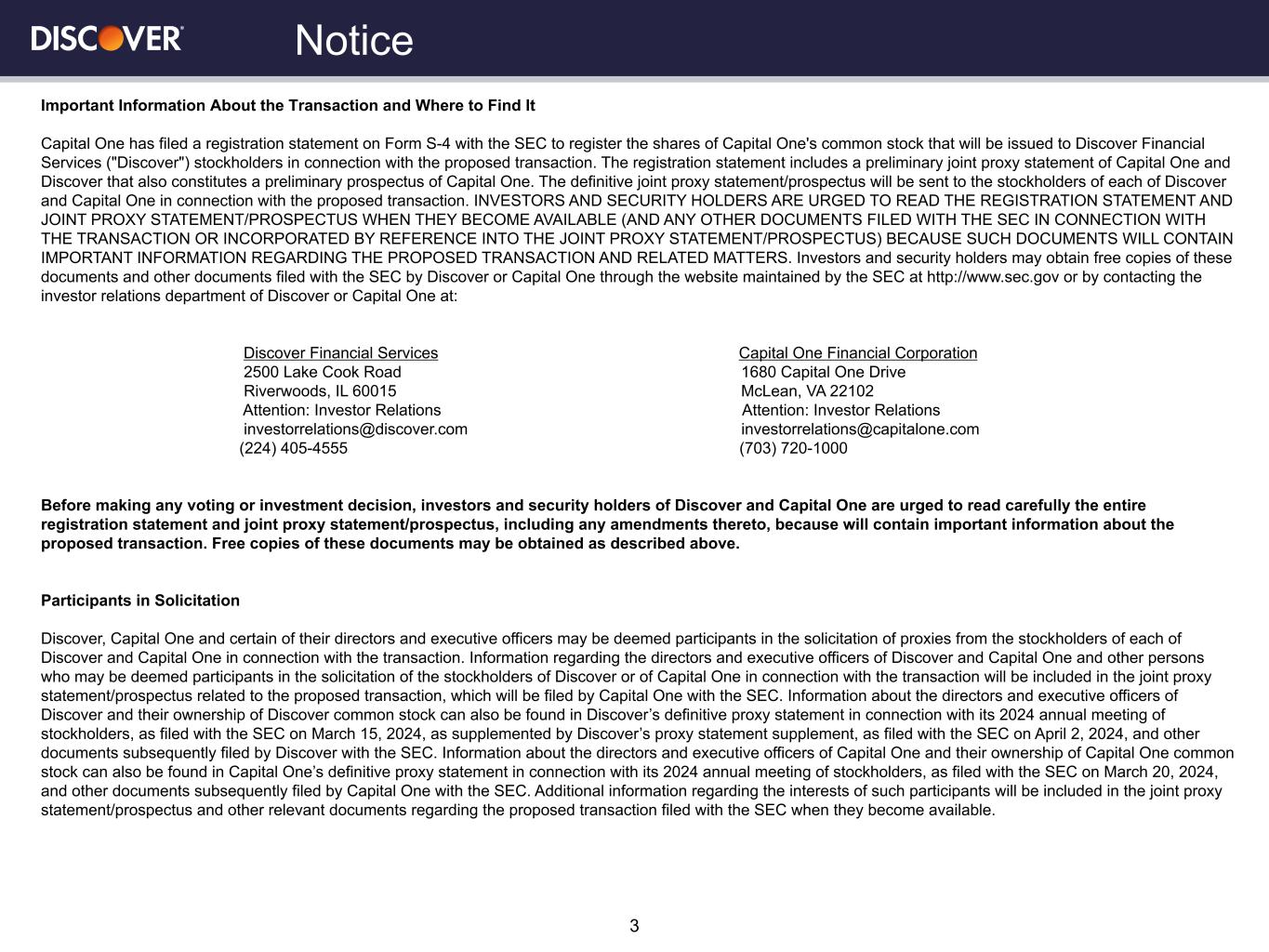 Important Information About the Transaction and Where to Find It Capital One has filed a registration statement on Form S-4 with the SEC to register the shares of Capital One's common stock that will be issued to Discover Financial Services ("Discover") stockholders in connection with the proposed transaction. The registration statement includes a preliminary joint proxy statement of Capital One and Discover that also constitutes a preliminary prospectus of Capital One. The definitive joint proxy statement/prospectus will be sent to the stockholders of each of Discover and Capital One in connection with the proposed transaction. INVESTORS AND SECURITY HOLDERS ARE URGED TO READ THE REGISTRATION STATEMENT AND JOINT PROXY STATEMENT/PROSPECTUS WHEN THEY BECOME AVAILABLE (AND ANY OTHER DOCUMENTS FILED WITH THE SEC IN CONNECTION WITH THE TRANSACTION OR INCORPORATED BY REFERENCE INTO THE JOINT PROXY STATEMENT/PROSPECTUS) BECAUSE SUCH DOCUMENTS WILL CONTAIN IMPORTANT INFORMATION REGARDING THE PROPOSED TRANSACTION AND RELATED MATTERS. Investors and security holders may obtain free copies of these documents and other documents filed with the SEC by Discover or Capital One through the website maintained by the SEC at http://www.sec.gov or by contacting the investor relations department of Discover or Capital One at: Discover Financial Services Capital One Financial Corporation 2500 Lake Cook Road 1680 Capital One Drive Riverwoods, IL 60015 McLean, VA 22102 Attention: Investor Relations Attention: Investor Relations investorrelations@discover.com investorrelations@capitalone.com (224) 405-4555 (703) 720-1000 Before making any voting or investment decision, investors and security holders of Discover and Capital One are urged to read carefully the entire registration statement and joint proxy statement/prospectus, including any amendments thereto, because will contain important information about the proposed transaction. Free copies of these documents may be obtained as described above. Participants in Solicitation Discover, Capital One and certain of their directors and executive officers may be deemed participants in the solicitation of proxies from the stockholders of each of Discover and Capital One in connection with the transaction. Information regarding the directors and executive officers of Discover and Capital One and other persons who may be deemed participants in the solicitation of the stockholders of Discover or of Capital One in connection with the transaction will be included in the joint proxy statement/prospectus related to the proposed transaction, which will be filed by Capital One with the SEC. Information about the directors and executive officers of Discover and their ownership of Discover common stock can also be found in Discover’s definitive proxy statement in connection with its 2024 annual meeting of stockholders, as filed with the SEC on March 15, 2024, as supplemented by Discover’s proxy statement supplement, as filed with the SEC on April 2, 2024, and other documents subsequently filed by Discover with the SEC. Information about the directors and executive officers of Capital One and their ownership of Capital One common stock can also be found in Capital One’s definitive proxy statement in connection with its 2024 annual meeting of stockholders, as filed with the SEC on March 20, 2024, and other documents subsequently filed by Capital One with the SEC. Additional information regarding the interests of such participants will be included in the joint proxy statement/prospectus and other relevant documents regarding the proposed transaction filed with the SEC when they become available. Notice 3
