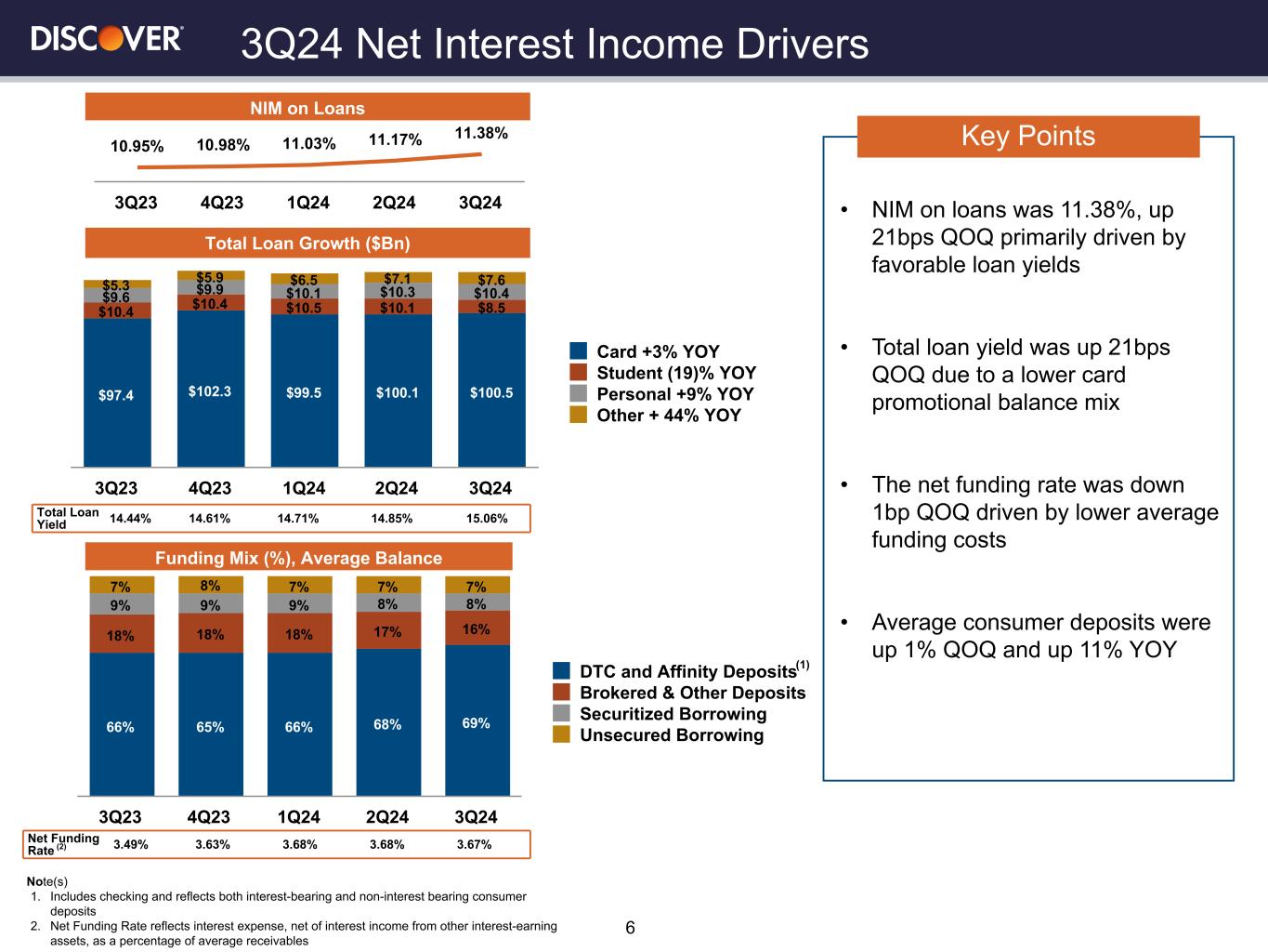 • NIM on loans was 11.38%, up 21bps QOQ primarily driven by favorable loan yields • Total loan yield was up 21bps QOQ due to a lower card promotional balance mix • The net funding rate was down 1bp QOQ driven by lower average funding costs • Average consumer deposits were up 1% QOQ and up 11% YOY 3Q24 Net Interest Income Drivers 6 Key Points Note(s) 1. Includes checking and reflects both interest-bearing and non-interest bearing consumer deposits 2. Net Funding Rate reflects interest expense, net of interest income from other interest-earning assets, as a percentage of average receivables 10.95% 10.98% 11.03% 11.17% 11.38% 3Q23 4Q23 1Q24 2Q24 3Q24 NIM on Loans Total Loan Growth ($Bn) Funding Mix (%), Average Balance $97.4 $102.3 $99.5 $100.1 $100.5 $10.4 $10.4 $10.5 $10.1 $8.5 $9.6 $9.9 $10.1 $10.3 $10.4$5.3 $5.9 $6.5 $7.1 $7.6 Card +3% YOY Student (19)% YOY Personal +9% YOY Other + 44% YOY 3Q23 4Q23 1Q24 2Q24 3Q24 66% 65% 66% 68% 69% 18% 18% 18% 17% 16% 9% 9% 9% 8% 8% 7% 8% 7% 7% 7% DTC and Affinity Deposits Brokered & Other Deposits Securitized Borrowing Unsecured Borrowing 3Q23 4Q23 1Q24 2Q24 3Q24 Total Loan Yield 14.44% 14.61% 14.71% 14.85% 15.06% Net Funding Rate (2) 3.49% 3.63% 3.68% 3.68% 3.67% (1)
