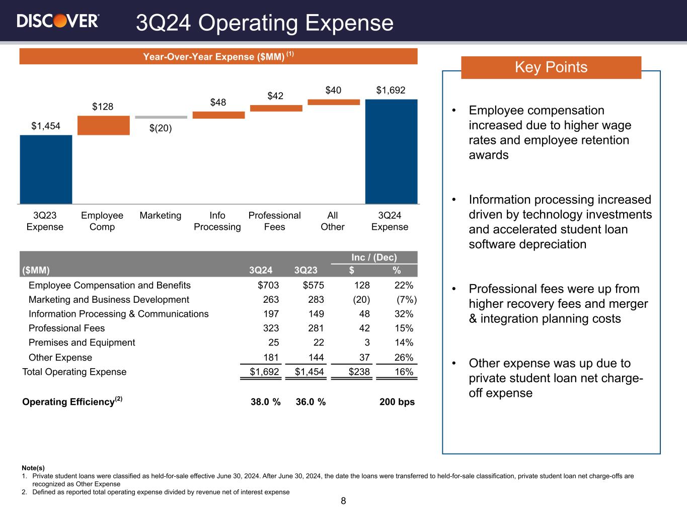 Note(s) 1. Rewards rate represents credit card rewards cost divided by Discover Card sales volume • Net interest income increased due to higher loan receivables and margin expansion • Net discount / interchange revenue was down 4% from lower spend • Loan fee income was up from higher instances • Other income increased reflecting a $70MM gain from the loan sale • The rewards rate was up 2bps YOY driven by a change in the 5% category 3Q24 Grocery, Walmart 3Q23 Gas, e-Wallet 3Q24 Revenue 7 Key Points Inc / (Dec) ($MM) 3Q24 3Q23 $ % Net Interest Income 3,655 3,322 333 10% Net Discount/Interchange Revenue 363 377 (14) (4%) Protection Products Revenue 42 42 — —% Loan Fee Income 214 194 20 10% Transaction Processing Revenue 84 82 2 2% Other Income 95 27 68 NM Total Non-Interest Income 798 722 76 11% Revenue Net of Interest Expense $4,453 $4,044 $409 10% Change 3Q24 3Q23 QOQ YOY Discover Card Sales Volume ($MM) $53,380 $54,952 — % (3%) Rewards Rate(1) 1.44 % 1.42 % 12 bps 2 bps $4,044 $333 $(14) $20 $2 $68 $4,453 3Q23 Rev Net of Int Exp Net Interest Income Net Discount/ Interchange Loan Fee Income Transaction Processing Other Income 3Q24 Rev Net of Int Exp Year-Over-Year Revenue ($MM) (1)