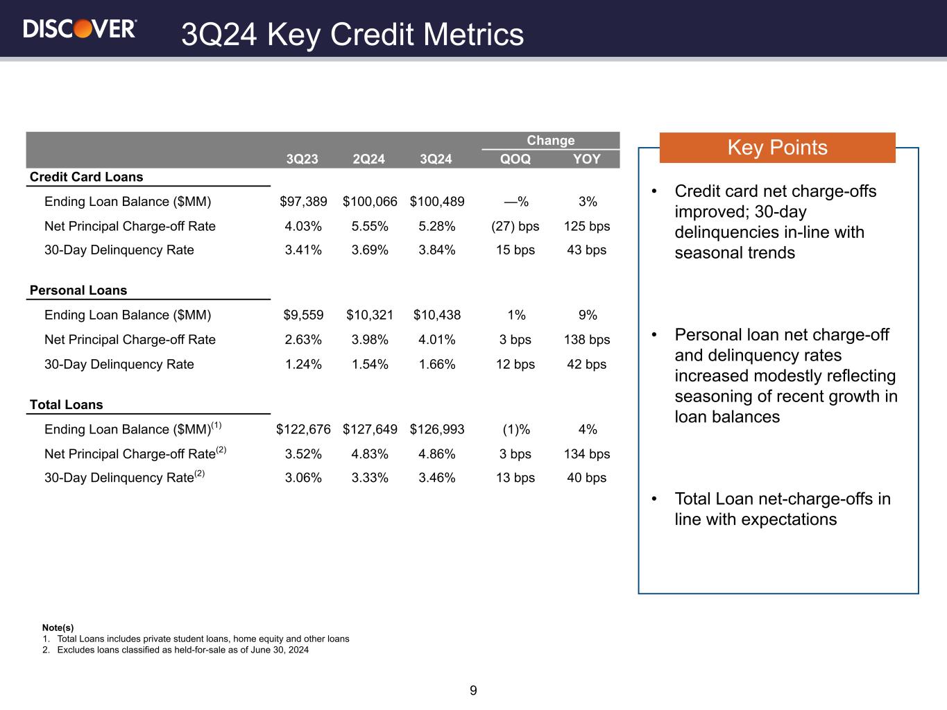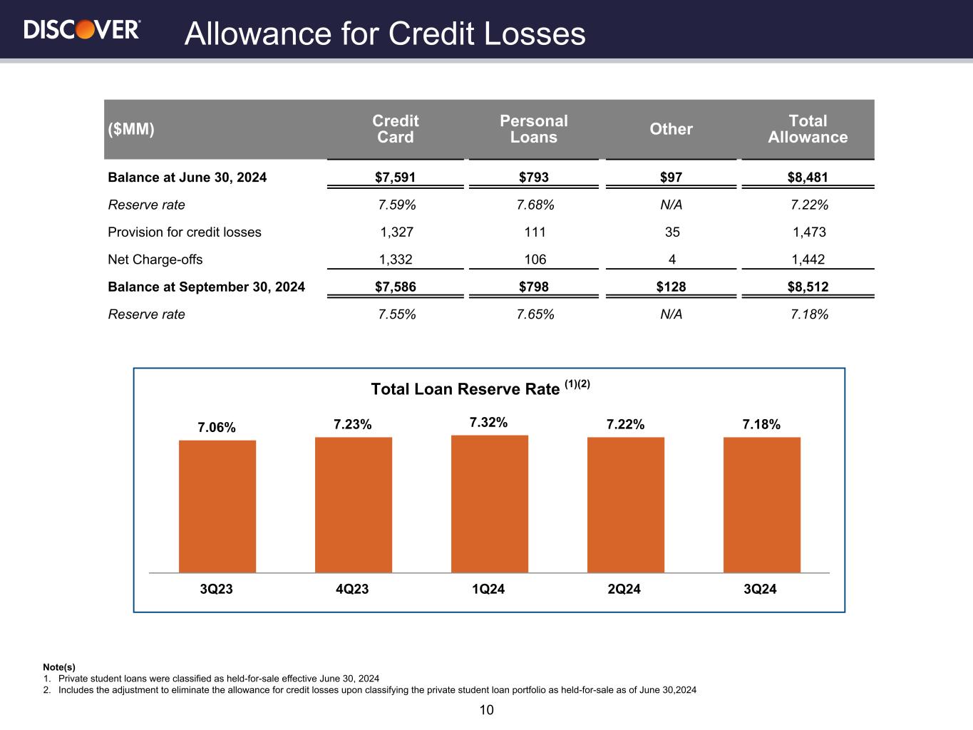 • Credit card net charge-offs improved; 30-day delinquencies in-line with seasonal trends • Personal loan net charge-off and delinquency rates increased modestly reflecting seasoning of recent growth in loan balances • Total Loan net-charge-offs in line with expectations 3Q24 Key Credit Metrics 9 Key PointsChange 3Q23 2Q24 3Q24 QOQ YOY Credit Card Loans Ending Loan Balance ($MM) $97,389 $100,066 $100,489 —% 3% Net Principal Charge-off Rate 4.03% 5.55% 5.28% (27) bps 125 bps 30-Day Delinquency Rate 3.41% 3.69% 3.84% 15 bps 43 bps Personal Loans Ending Loan Balance ($MM) $9,559 $10,321 $10,438 1% 9% Net Principal Charge-off Rate 2.63% 3.98% 4.01% 3 bps 138 bps 30-Day Delinquency Rate 1.24% 1.54% 1.66% 12 bps 42 bps Total Loans Ending Loan Balance ($MM)(1) $122,676 $127,649 $126,993 (1)% 4% Net Principal Charge-off Rate(2) 3.52% 4.83% 4.86% 3 bps 134 bps 30-Day Delinquency Rate(2) 3.06% 3.33% 3.46% 13 bps 40 bps Note(s) 1. Total Loans includes private student loans, home equity and other loans 2. Excludes loans classified as held-for-sale as of June 30, 2024