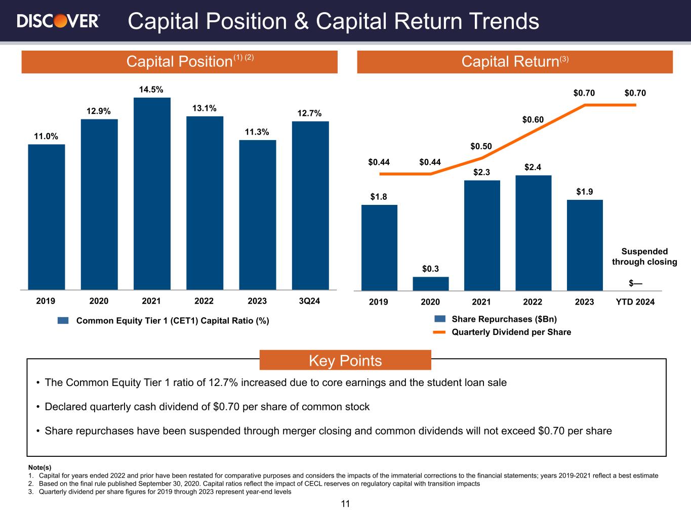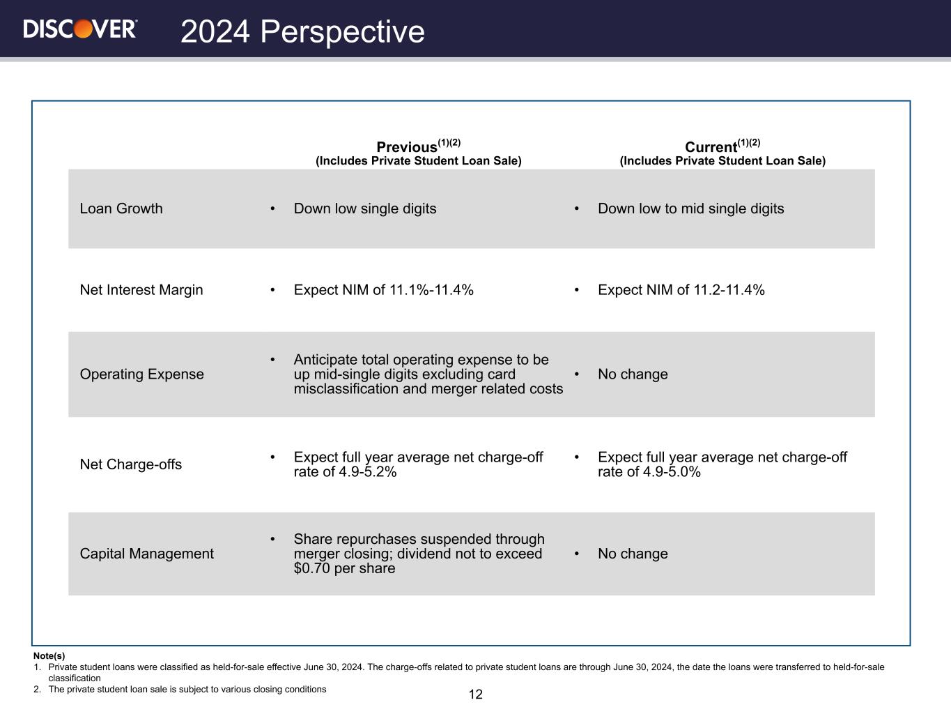 12 2024 Perspective Previous(1)(2) (Includes Private Student Loan Sale) Current(1)(2) (Includes Private Student Loan Sale) Loan Growth • Down low single digits • Down low to mid single digits Net Interest Margin • Expect NIM of 11.1%-11.4% • Expect NIM of 11.2-11.4% Operating Expense • Anticipate total operating expense to be up mid-single digits excluding card misclassification and merger related costs • No change Net Charge-offs • Expect full year average net charge-off rate of 4.9-5.2% • Expect full year average net charge-off rate of 4.9-5.0% Capital Management • Share repurchases suspended through merger closing; dividend not to exceed $0.70 per share • No change Note(s) 1. Private student loans were classified as held-for-sale effective June 30, 2024. The charge-offs related to private student loans are through June 30, 2024, the date the loans were transferred to held-for-sale classification 2. The private student loan sale is subject to various closing conditions