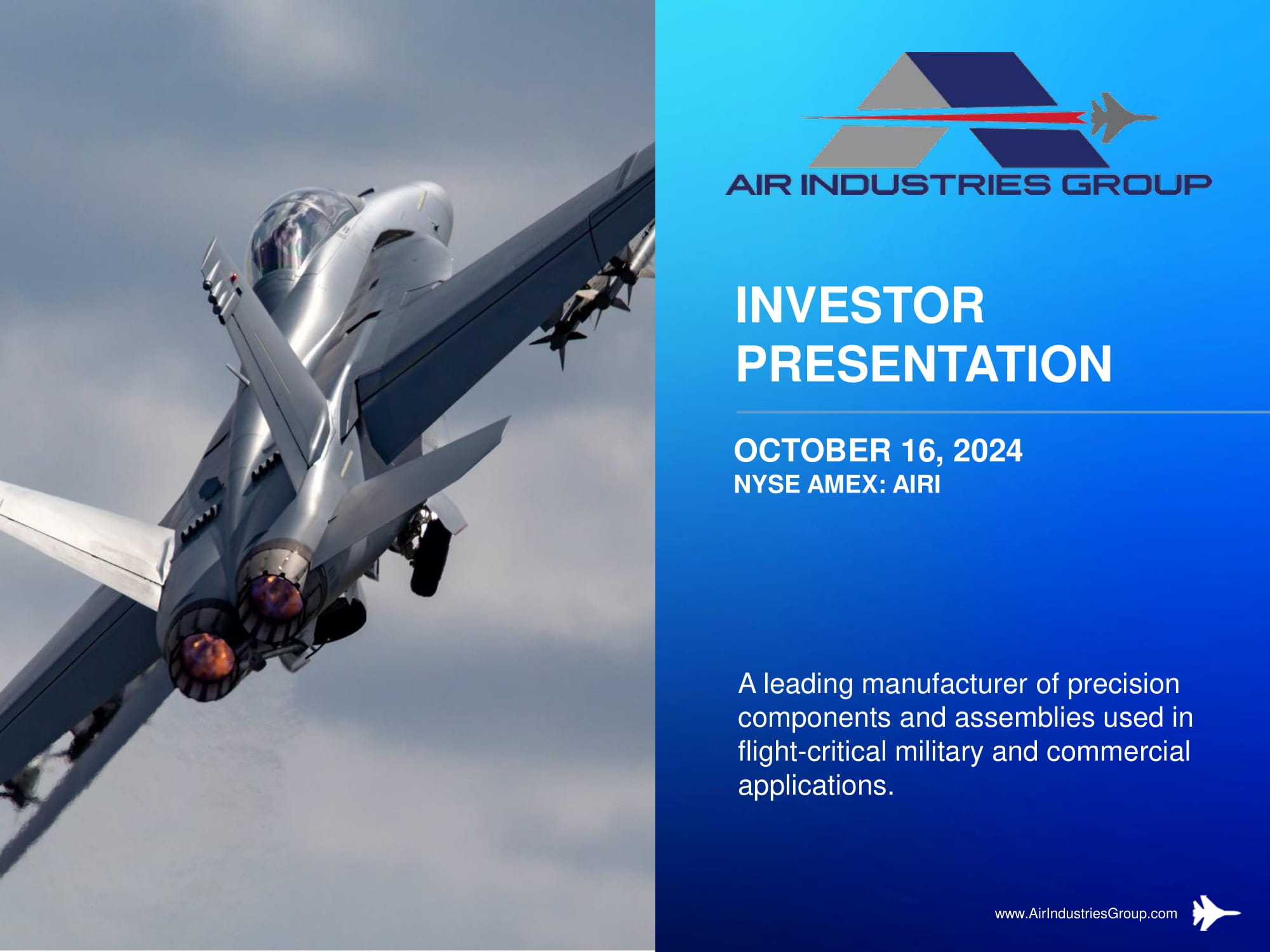 INVESTOR PRESENTATION OCTOBER 16, 2024 NYSE AMEX: AIRI A leading manufacturer of precision components and assemblies used in flight - critical military and commercial applications. www.AirIndustriesGroup.com