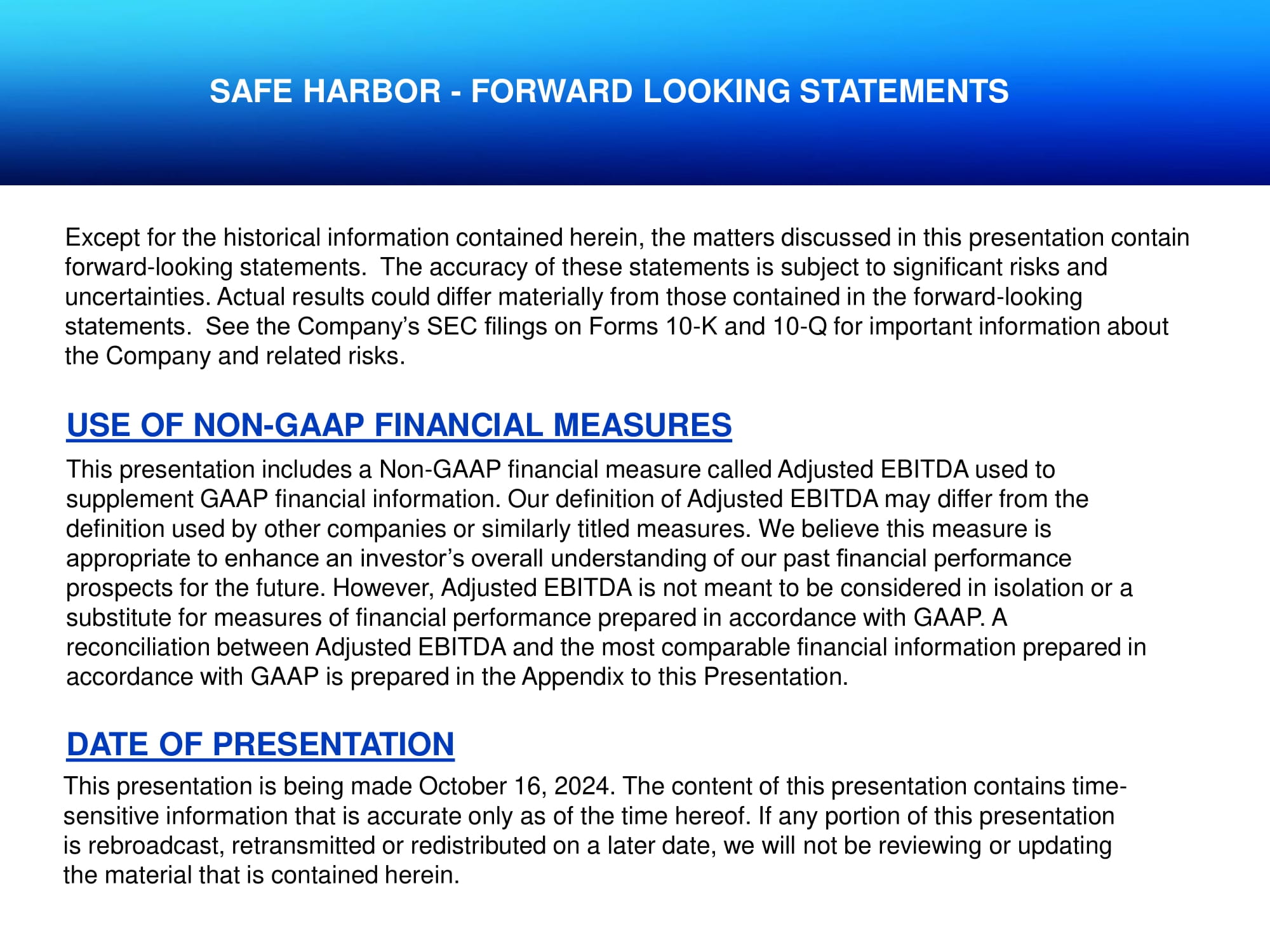 Except for the historical information contained herein, the matters discussed in this presentation contain forward - looking statements. The accuracy of these statements is subject to significant risks and uncertainties. Actual results could differ materially from those contained in the forward - looking statements. See the Company’s SEC filings on Forms 10 - K and 10 - Q for important information about the Company and related risks. SAFE HARBOR - FORWARD LOOKING STATEMENTS USE OF NON - GAAP FINANCIAL MEASURES This presentation includes a Non - GAAP financial measure called Adjusted EBITDA used to supplement GAAP financial information. Our definition of Adjusted EBITDA may differ from the definition used by other companies or similarly titled measures. We believe this measure is appropriate to enhance an investor’s overall understanding of our past financial performance prospects for the future. However, Adjusted EBITDA is not meant to be considered in isolation or a substitute for measures of financial performance prepared in accordance with GAAP. A reconciliation between Adjusted EBITDA and the most comparable financial information prepared in accordance with GAAP is prepared in the Appendix to this Presentation. This presentation is being made October 16, 2024. The content of this presentation contains time - sensitive information that is accurate only as of the time hereof. If any portion of this presentation is rebroadcast, retransmitted or redistributed on a later date, we will not be reviewing or updating the material that is contained herein. DATE OF PRESENTATION