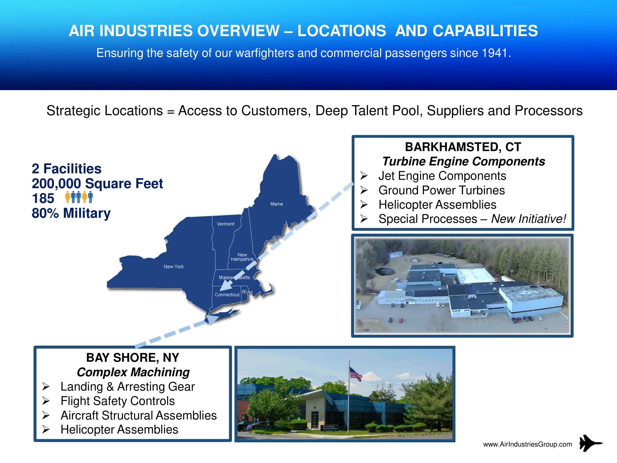 Air Industries Group is a Tier 1 supplier to Original Equipment Manufacturers (OEMs), and a Prime Contractor to the U.S. Department of Defense. Air Industries has been long established in the Long Island, NY, aerospace community, known as the “Cradle of Aviation,” and Hartford, Connecticut’s “Aerospace Alley®”. Our facilities total over 200,000 square feet and employ approximately 185 highly skilled technicians.
