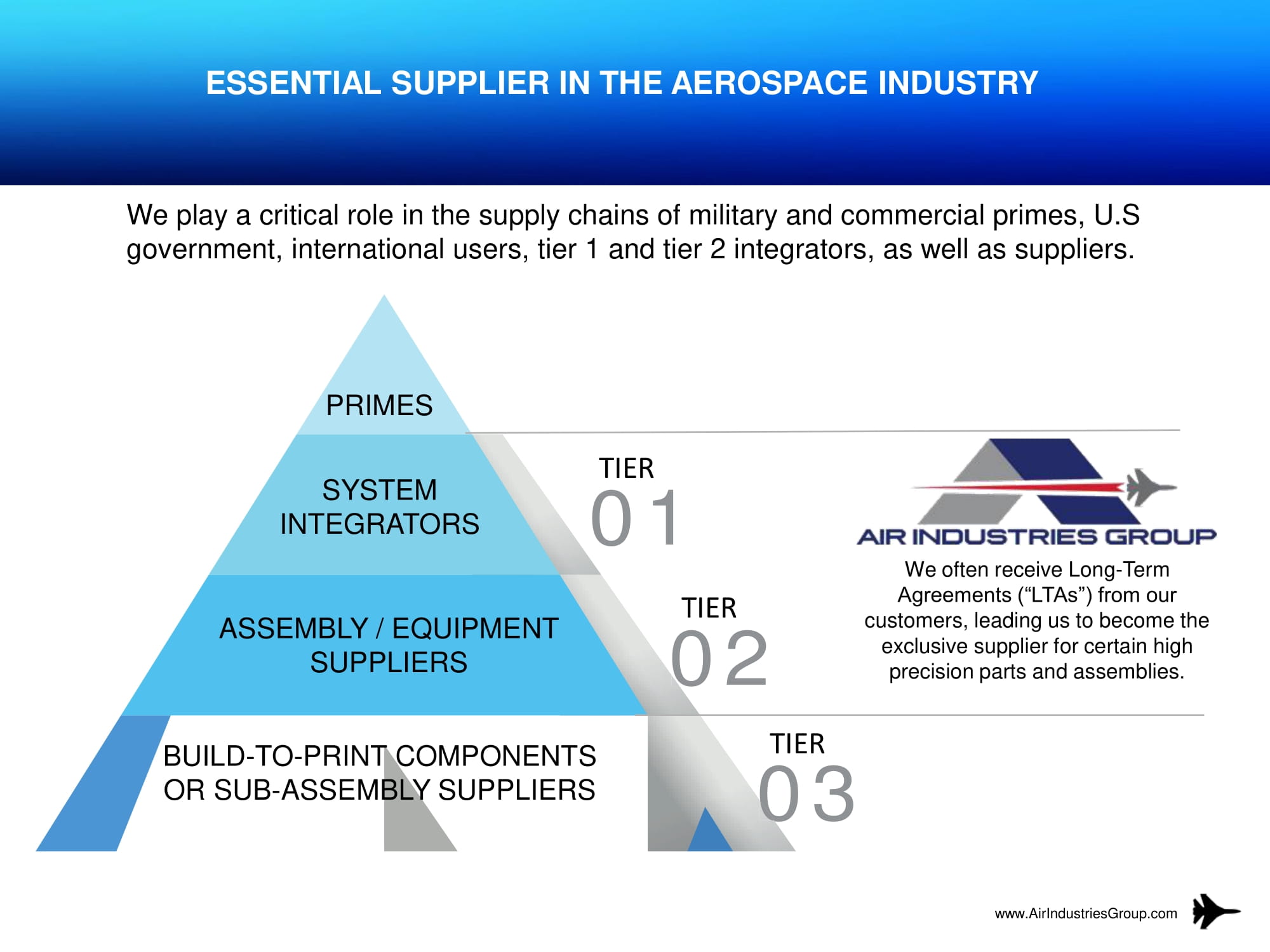 03 02 01 0 0 ESSENTIAL SUPPLIER IN THE AEROSPACE INDUSTRY We play a critical role in the supply chains of military and commercial primes, U.S government, international users, tier 1 and tier 2 integrators, as well as suppliers. We often receive Long - Term Agreements (“LTAs”) from our customers, leading us to become the exclusive supplier for certain high precision parts and assemblies. www.AirIndustriesGroup.com PRIMES SYSTEM INTEGRATORS ASSEMBLY / EQUIPMENT SUPPLIERS BUILD - TO - PRINT COMPONENTS OR SUB - ASSEMBLY SUPPLIERS TIER TIER TIER