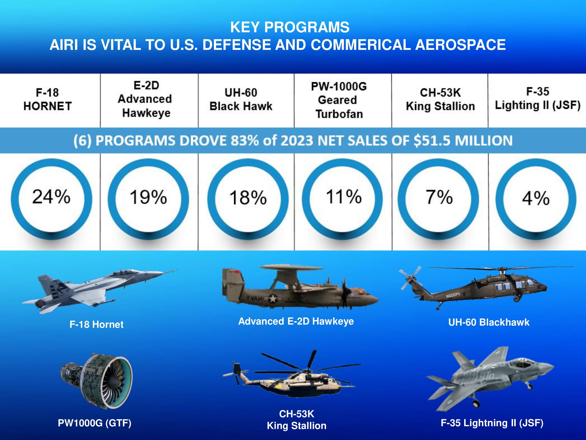 KEY PROGRAMS AIRI IS VITAL TO U.S. DEFENSE AND COMMERICAL AEROSPACE UH - 60 Blackhawk F - 18 Hornet Advanced E - 2D Hawkeye PW1000G (GTF) CH - 53K King Stallion F - 35 Lightning II (JSF)