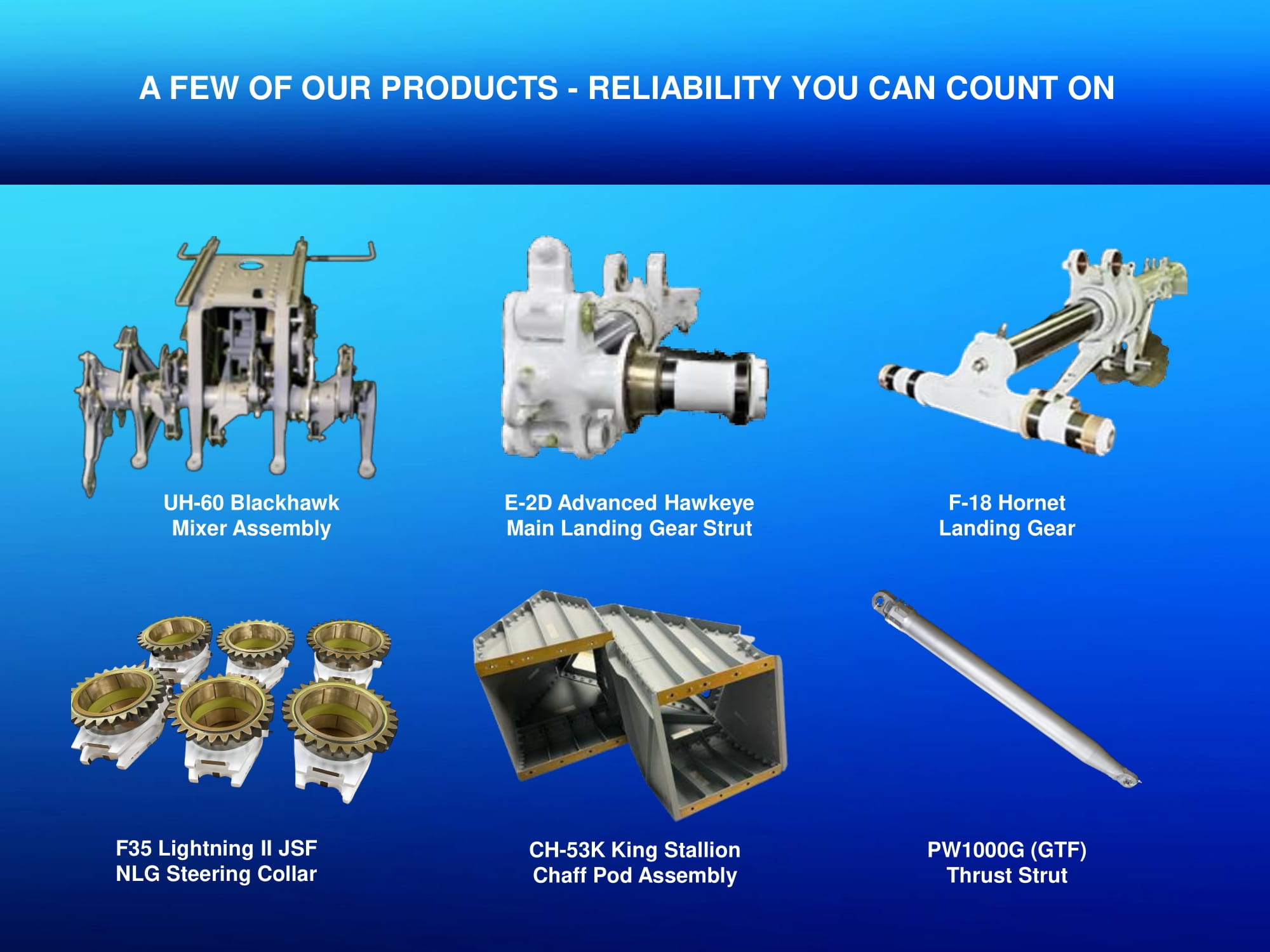 A FEW OF OUR PRODUCTS - RELIABILITY YOU CAN COUNT ON UH - 60 Blackhawk Mixer Assembly F - 18 Hornet Landing Gear E - 2D Advanced Hawkeye Main Landing Gear Strut PW1000G (GTF) Thrust Strut CH - 53K King Stallion Chaff Pod Assembly F35 Lightning II JSF NLG Steering Collar