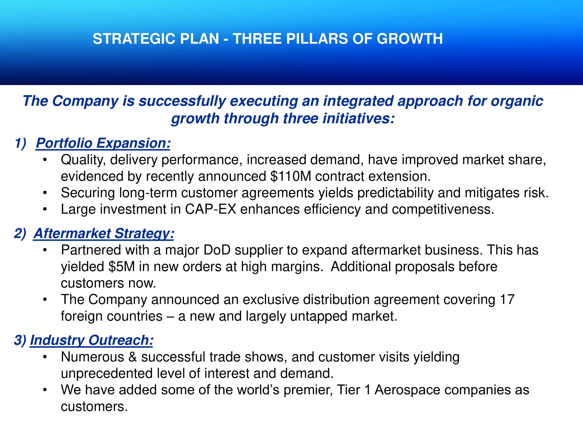 STRATEGIC PLAN - THREE PILLARS OF GROWTH The Company is successfully executing an integrated approach for organic growth through three initiatives: 1) Portfolio Expansion: • Quality, delivery performance, increased demand, have improved market share, evidenced by recently announced $110M contract extension. • Securing long - term customer agreements yields predictability and mitigates risk. • Large investment in CAP - EX enhances efficiency and competitiveness. 2) Aftermarket Strategy: • Partnered with a major DoD supplier to expand aftermarket business. This has yielded $5M in new orders at high margins. Additional proposals before customers now. • The Company announced an exclusive distribution agreement covering 17 foreign countries – a new and largely untapped market. 3) Industry Outreach: • Numerous & successful trade shows, and customer visits yielding unprecedented level of interest and demand. • We have added some of the world’s premier, Tier 1 Aerospace companies as customers.