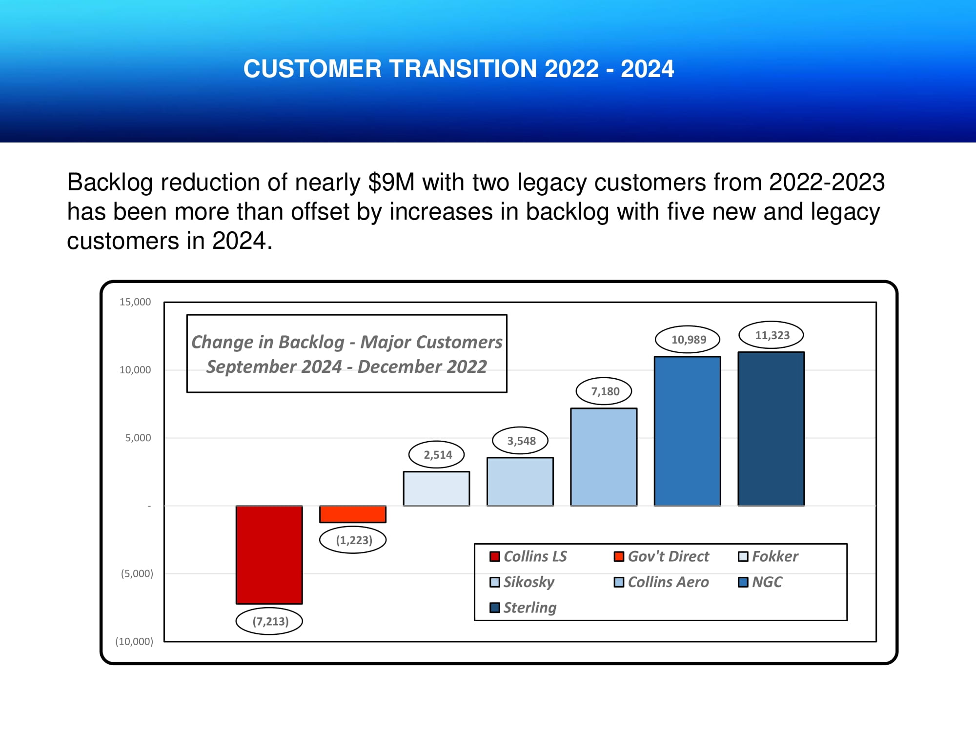 CUSTOMER TRANSITION 2022 - 2024 Backlog reduction of nearly $9M with two legacy customers from 2022 - 2023 has been more than offset by increases in backlog with five new and legacy customers in 2024. (7,213) (1,223) 2,514 3,548 7,180 10,989 11,323 (10,000) (5,000) - 5,000 10,000 15,000 Change in Backlog - Major Customers September 2024 - December 2022 Collins LS Gov't Direct Fokker Sikosky Collins Aero NGC Sterling