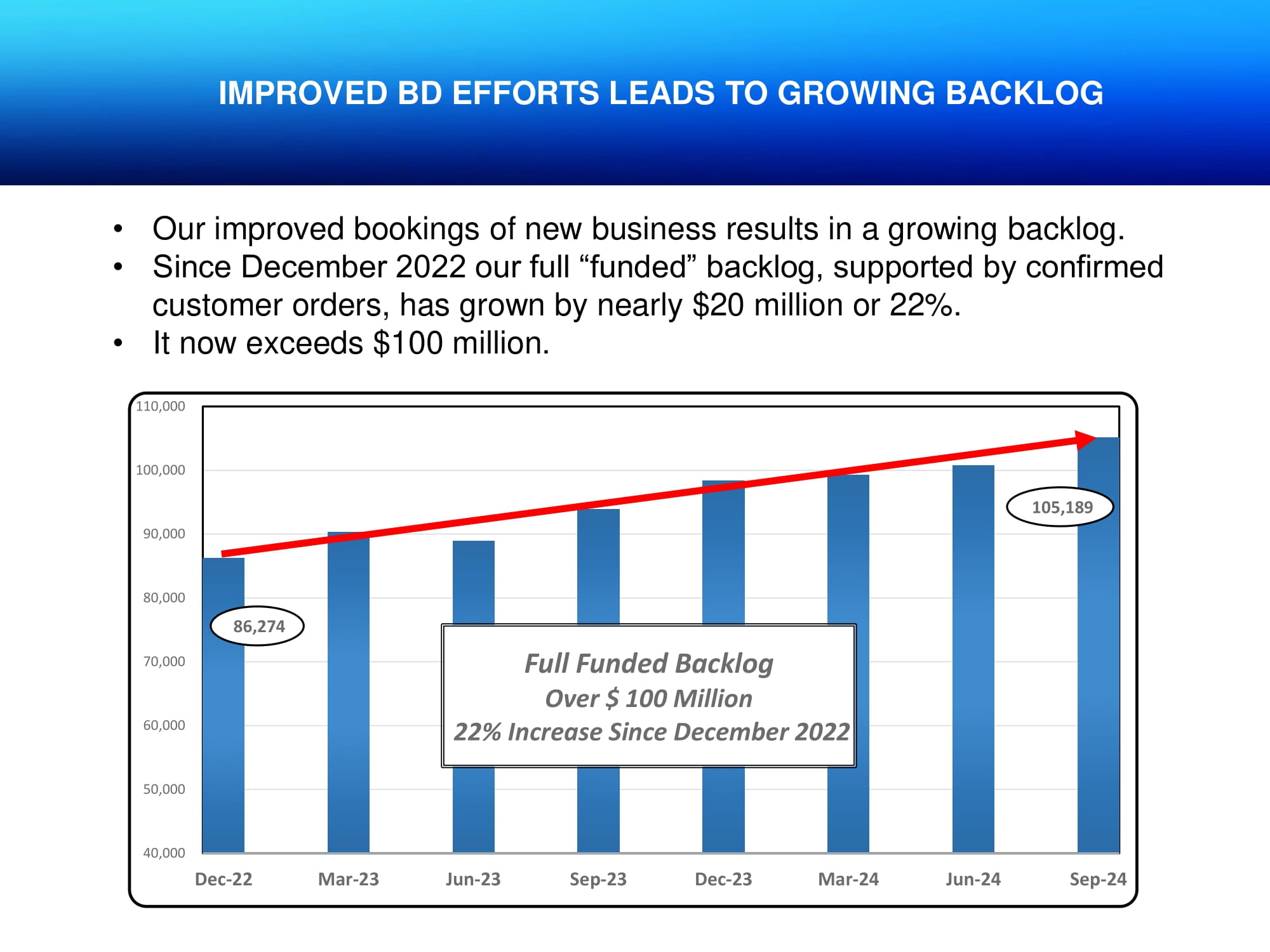 IMPROVED BD EFFORTS LEADS TO GROWING BACKLOG 86,274 105,189 40,000 50,000 60,000 70,000 80,000 90,000 100,000 110,000 Dec-22 Mar-23 Jun-23 Sep-23 Dec-23 Mar-24 Jun-24 Sep-24 Full Funded Backlog Over $ 100 Million 22% Increase Since December 2022 • Our improved bookings of new business results in a growing backlog. • Since December 2022 our full “funded” backlog, supported by confirmed customer orders, has grown by nearly $20 million or 22%. • It now exceeds $100 million.