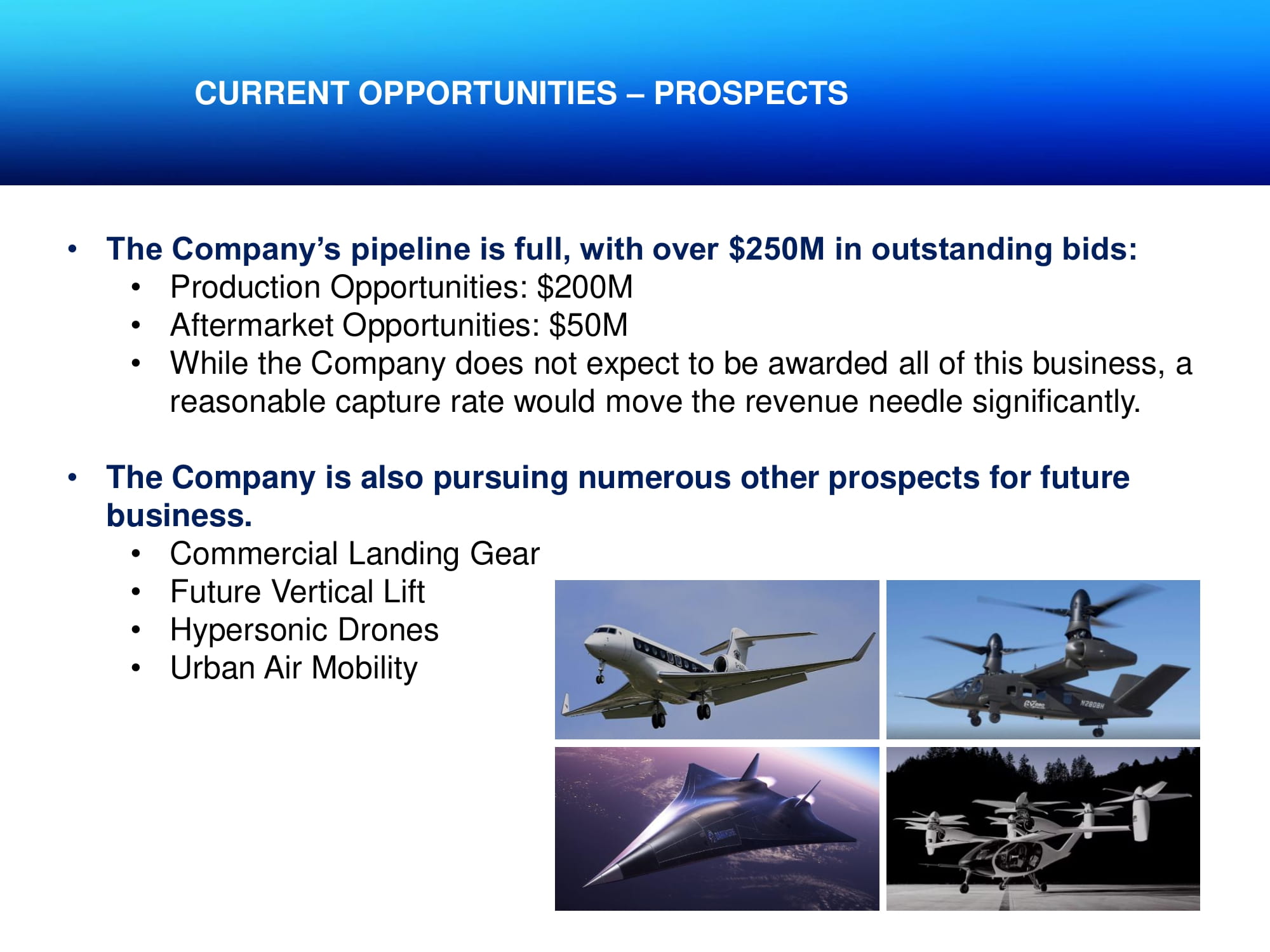 CURRENT OPPORTUNITIES – PROSPECTS • The Company’s pipeline is full, with over $250M in outstanding bids: • Production Opportunities: $200M • Aftermarket Opportunities: $50M • While the Company does not expect to be awarded all of this business, a reasonable capture rate would move the revenue needle significantly. • The Company is also pursuing numerous other prospects for future business. • Commercial Landing Gear • Future Vertical Lift • Hypersonic Drones • Urban Air Mobility