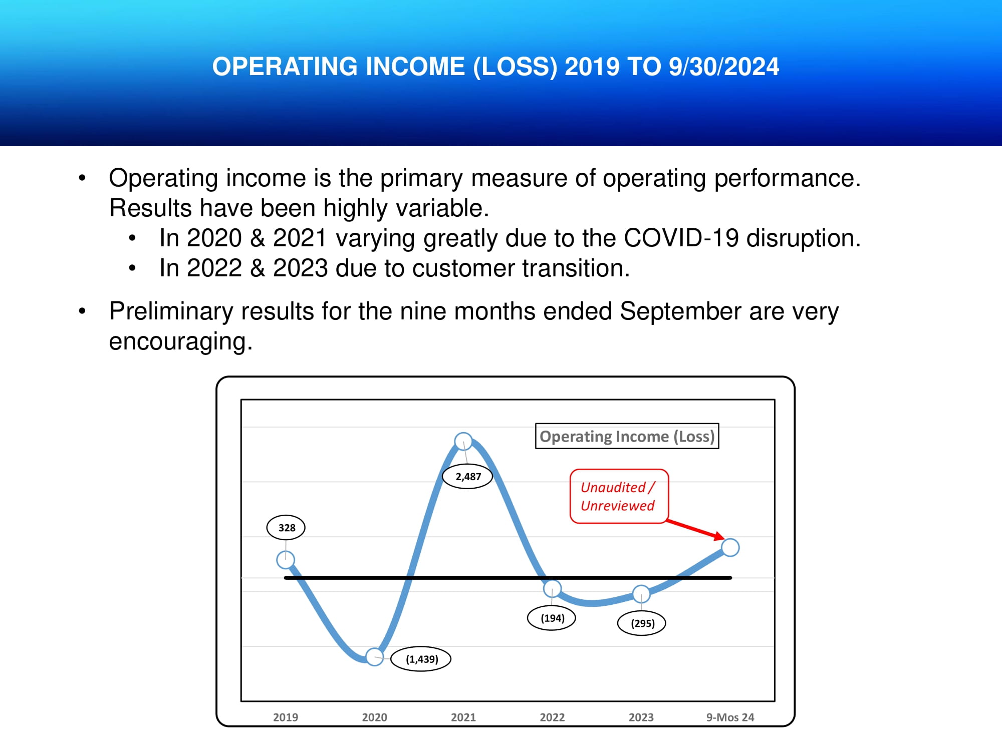 OPERATING INCOME (LOSS) 2019 TO 9/30/2024 • Operating income is the primary measure of operating performance. Results have been highly variable. • In 2020 & 2021 varying greatly due to the COVID - 19 disruption. • In 2022 & 2023 due to customer transition. • Preliminary results for the nine months ended September are very encouraging. 328 (1,439) 2,487 (194) (295) 2019 2020 2021 2022 2023 9-Mos 24 Operating Income (Loss) Unaudited / Unreviewed