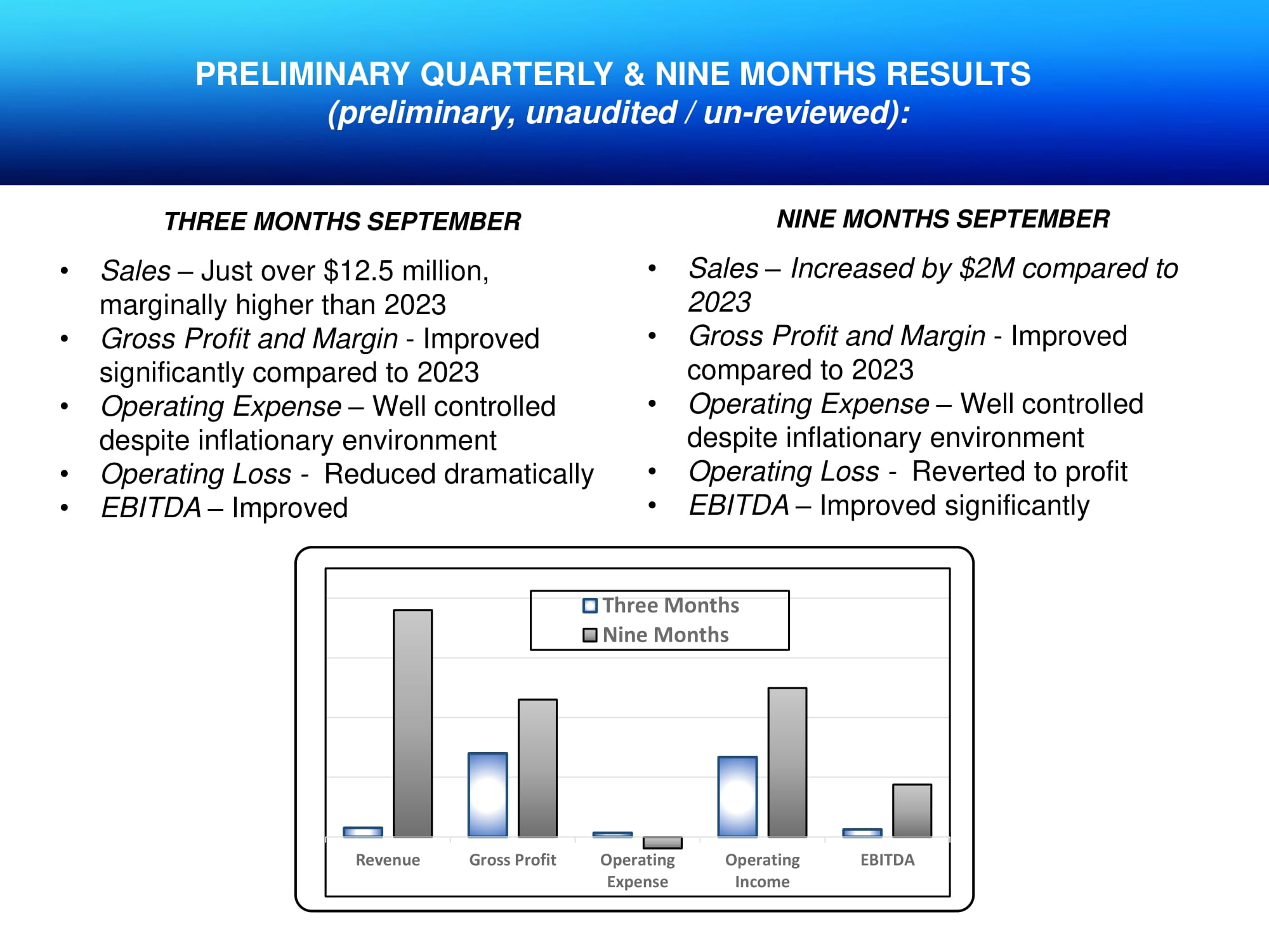 PRELIMINARY QUARTERLY & NINE MONTHS RESULTS (preliminary, unaudited / un - reviewed): THREE MONTHS SEPTEMBER • Sales – Just over $12.5 million, marginally higher than 2023 • Gross Profit and Margin - Improved significantly compared to 2023 • Operating Expense – Well controlled despite inflationary environment • Operating Loss - Reduced dramatically • EBITDA – Improved NINE MONTHS SEPTEMBER • Sales – Increased by $2M compared to 2023 • Gross Profit and Margin - Improved compared to 2023 • Operating Expense – Well controlled despite inflationary environment • Operating Loss - Reverted to profit • EBITDA – Improved significantly Revenue Gross Profit Operating Expense Operating Income EBITDA Three Months Nine Months