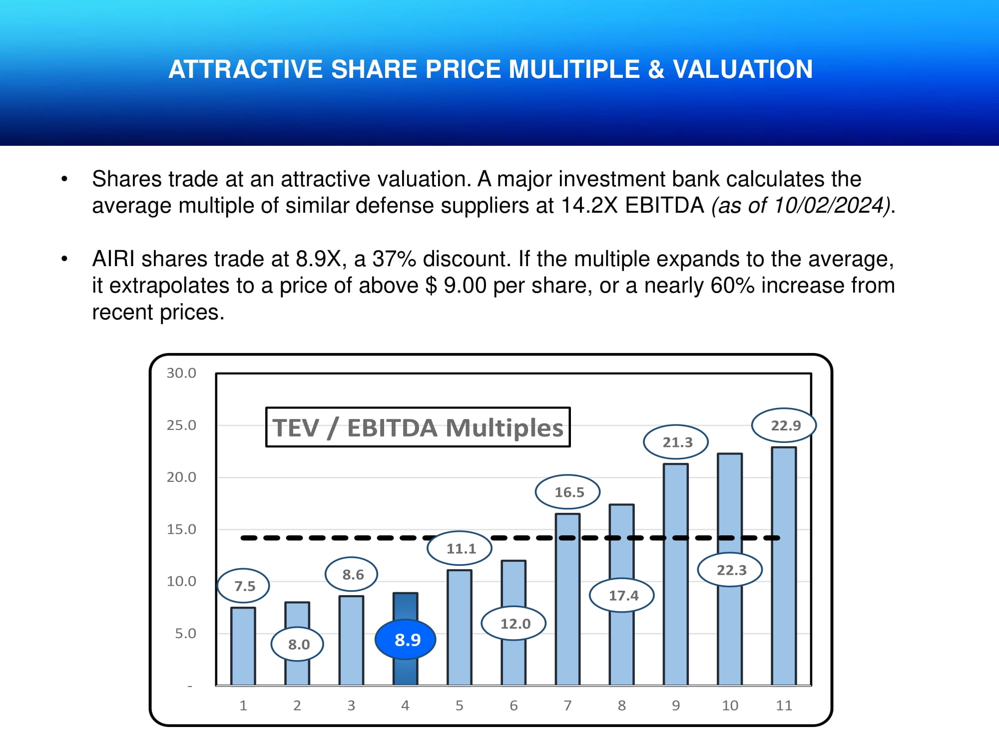 ATTRACTIVE SHARE PRICE MULITIPLE & VALUATION • Shares trade at an attractive valuation. A major investment bank calculates the average multiple of similar defense suppliers at 14.2X EBITDA (as of 10/02/2024) . • AIRI shares trade at 8.9X, a 37% discount. If the multiple expands to the average, it extrapolates to a price of above $ 9.00 per share, or a nearly 60% increase from recent prices. 7.5 8.0 8.6 8.9 11.1 12.0 16.5 17.4 21.3 22.3 22.9 - 5.0 10.0 15.0 20.0 25.0 30.0 1 2 3 4 5 6 7 8 9 10 11 TEV / EBITDA Multiples