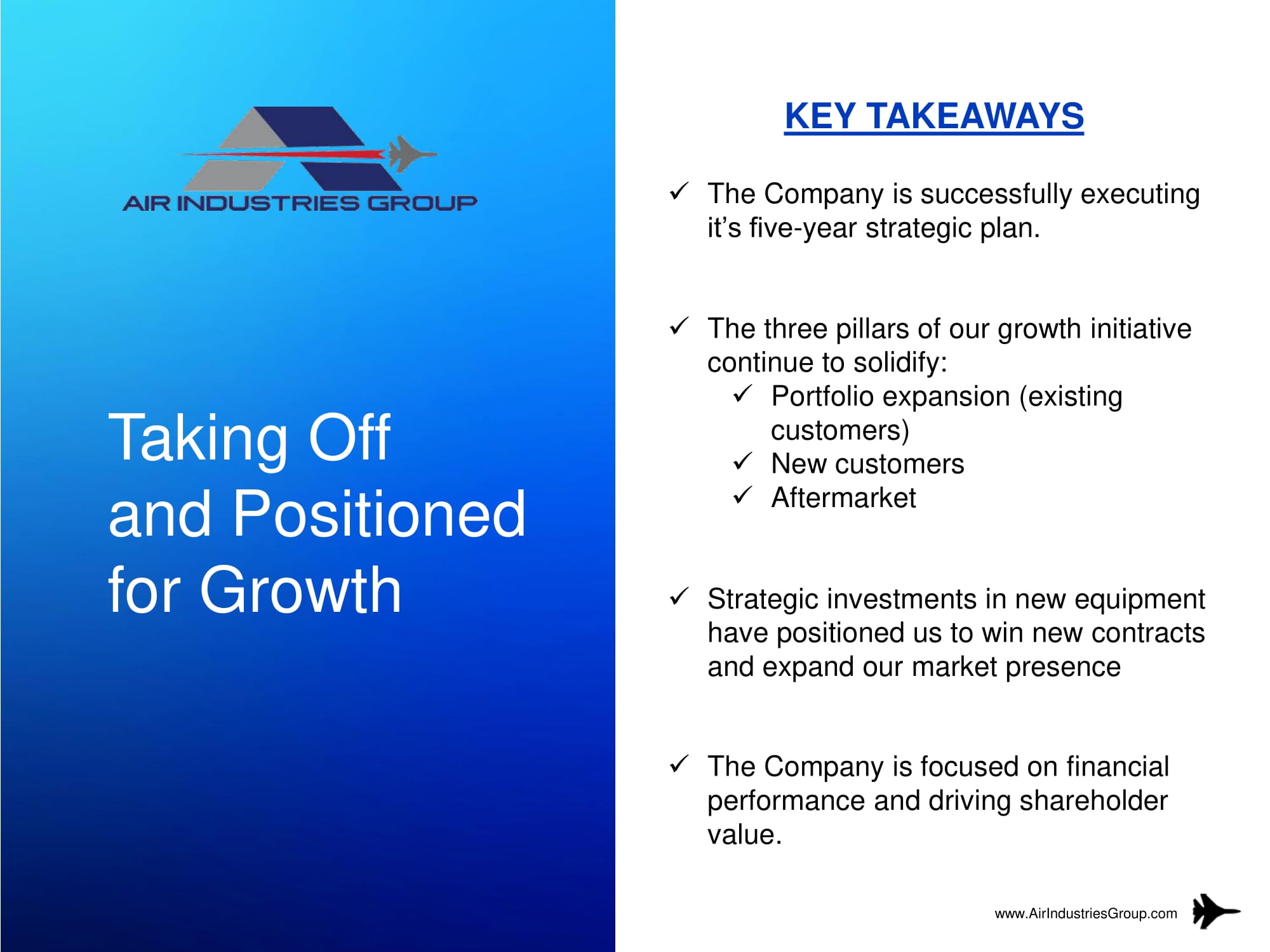 Taking Off and Positioned for Growth x The Company is successfully executing it’s five - year strategic plan. x The three pillars of our growth initiative continue to solidify: x Portfolio expansion (existing customers) x New customers x Aftermarket x Strategic investments in new equipment have positioned us to win new contracts and expand our market presence x The Company is focused on financial performance and driving shareholder value. www.AirIndustriesGroup.com KEY TAKEAWAYS