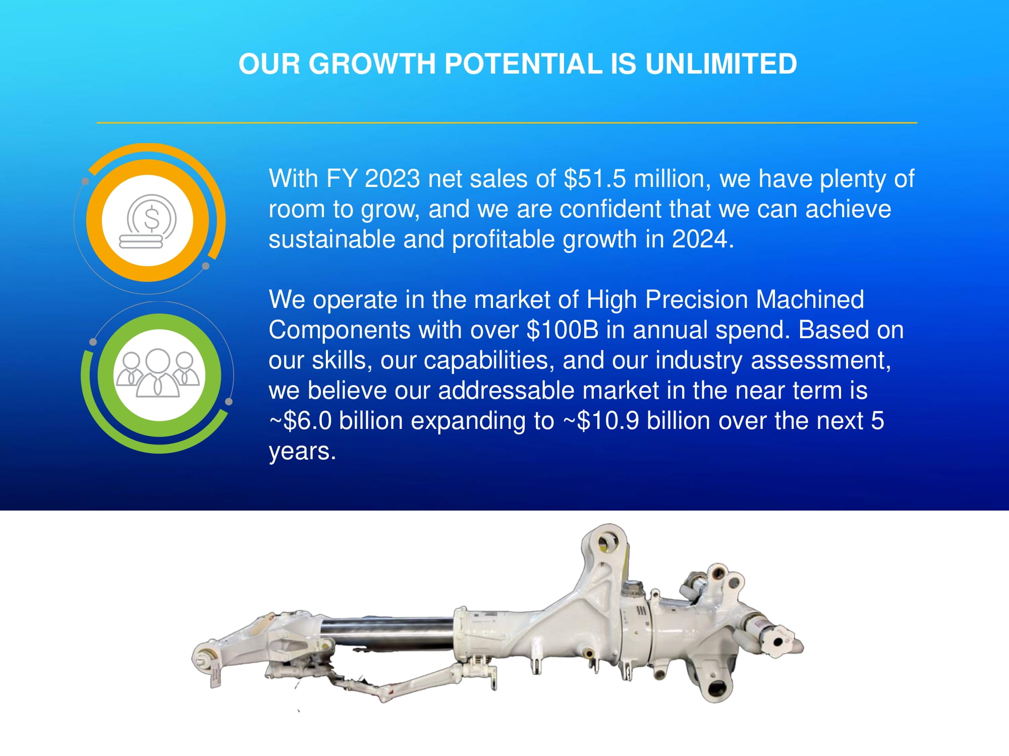 OUR GROWTH POTENTIAL IS UNLIMITED With FY 2023 net sales of $51.5 million, we have plenty of room to grow, and we are confident that we can achieve sustainable and profitable growth in 2024. We operate in the market of High Precision Machined Components with over $100B in annual spend. Based on our skills, our capabilities, and our industry assessment, we believe our addressable market in the near term is ~$6.0 billion expanding to ~$10.9 billion over the next 5 years.