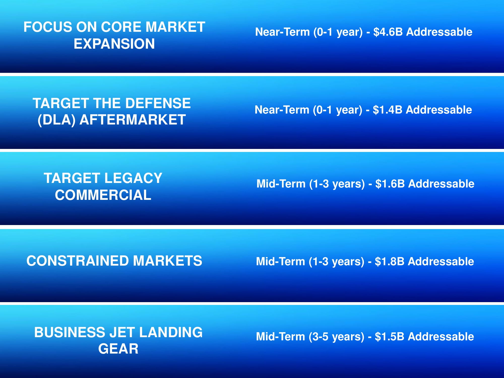 FOCUS ON CORE MARKET EXPANSION Near - Term (0 - 1 year) - $4.6B Addressable www.AirIndustriesGroup.com TARGET THE DEFENSE (DLA) AFTERMARKET TARGET LEGACY COMMERCIAL CONSTRAINED MARKETS BUSINESS JET LANDING GEAR Near - Term (0 - 1 year) - $1.4B Addressable Mid - Term (1 - 3 years) - $1.6B Addressable Mid - Term (1 - 3 years) - $1.8B Addressable Mid - Term (3 - 5 years) - $1.5B Addressable