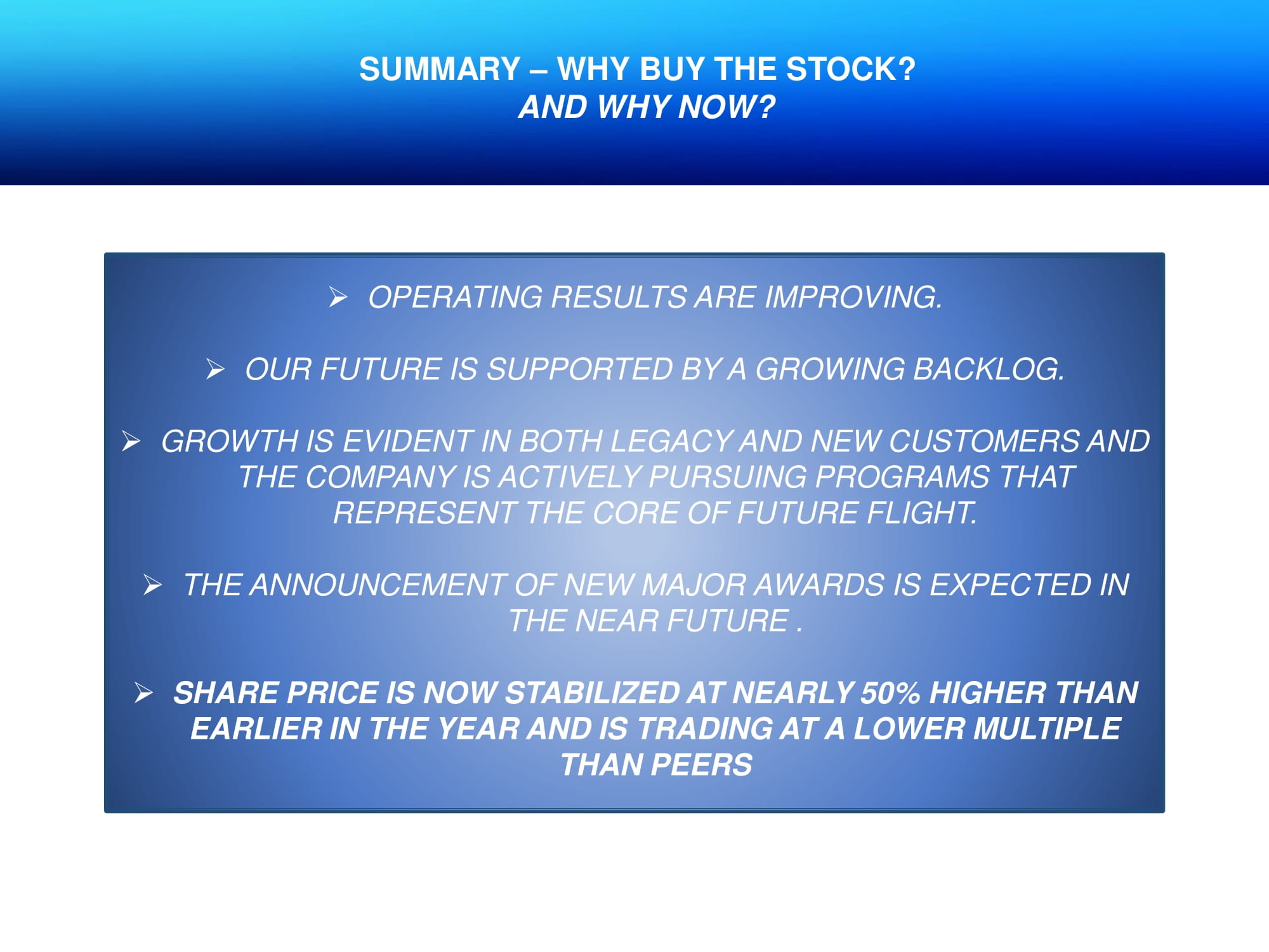 SUMMARY – WHY BUY THE STOCK? AND WHY NOW? » OPERATING RESULTS ARE IMPROVING . » OUR FUTURE IS SUPPORTED BY A GROWING BACKLOG. » GROWTH IS EVIDENT IN BOTH LEGACY AND NEW CUSTOMERS AND THE COMPANY IS ACTIVELY PURSUING PROGRAMS THAT REPRESENT THE CORE OF FUTURE FLIGHT. » THE ANNOUNCEMENT OF NEW MAJOR AWARDS IS EXPECTED IN THE NEAR FUTURE . » SHARE PRICE IS NOW STABILIZED AT NEARLY 50% HIGHER THAN EARLIER IN THE YEAR AND IS TRADING AT A LOWER MULTIPLE THAN PEERS