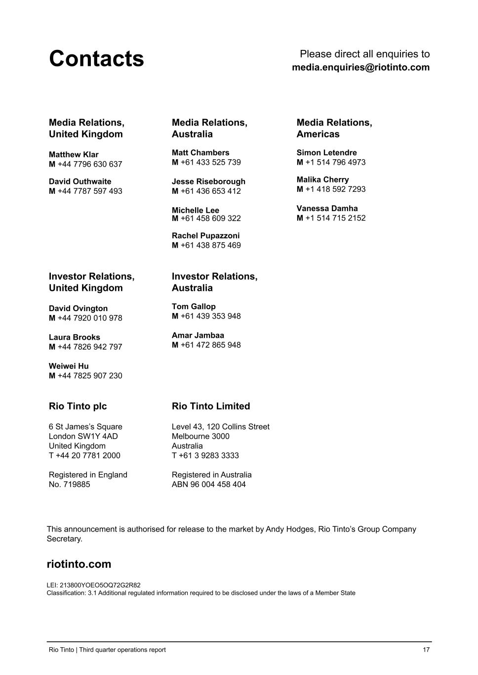 Rio Tinto plc | Rio Tinto Limited | ||