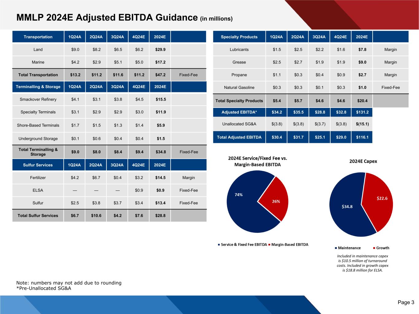 MMLP 3Q 2024 Adjusted EBITDA Reconciliation & Comparison to Guidance (in millions) Page 2 Terminalling & Storage 2024E Guidance 3Q24 Guidance 3Q24A Smackover Refinery $15.5 $4.5 $3.8 Specialty Terminals $11.9 $3.2 $2.9 Shore-Based Terminals $5.9 $0.9 $1.3 Underground Storage $1.5 $0.5 $0.4 Total Terminalling & Storage $34.8 $9.0 $8.4 Specialty Products 2024E Guidance 3Q24 Guidance 3Q24A Lubricants $7.8 $3.6 $2.2 Grease $9.0 $2.4 $1.9 Propane $2.7 $0.3 $0.4 Natural Gasoline $1.0 $0.2 $0.1 Total Specialty Products $20.4 $6.5 $4.6 Adjusted EBITDA* $131.2 $30.2 $28.8 Unallocated SG&A $(15.1) $(3.8) $(3.7) Total Adjusted EBITDA $116.1 $26.4 $25.1 Sulfur Services 2024E Guidance 3Q24 Guidance 3Q24A Fertilizer $14.5 $0.7 $0.4 ELSA $0.9 — — Sulfur $13.4 $3.1 $3.7 Total Sulfur Services $28.8 $3.7 $4.2 Transportation 2024E Guidance 3Q24 Guidance 3Q24A Land $29.9 $6.4 $6.5 Marine $17.2 $4.4 $5.1 Total Transportation $47.2 $10.8 $11.6 Note: numbers may not add due to rounding *Pre-Unallocated SG&A Transportation Terminalling & Storage Sulfur Services Specialty Products SG&A Interest Expense 3Q 2024 Actual Net income (loss) $8.6 $2.7 $1.3 $3.9 $(5.1) $(14.6) $(3.3) Interest expense add back — — — — — $14.6 $14.6 Income tax expense — — — — $1.4 — $1.4 Operating income (loss) $8.6 $2.7 $1.3 $3.9 $(3.7) $0.0 $12.7 Depreciation and amortization $3.2 $5.7 $2.9 $0.8 — — $12.6 Gain on sale or disposition of property, plant, and equipment $(0.1) — — $(0.1) — — $(0.2) Unit-based compensation — — — — — — $0.0 Adjusted EBITDA $11.6 $8.4 $4.2 $4.6 $(3.7) $0.0 $25.1