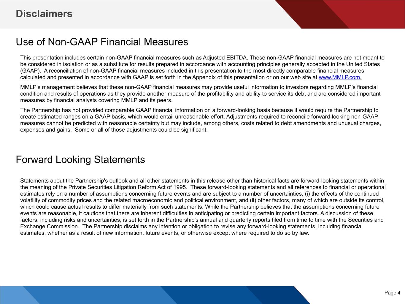 Disclaimers Page 4 Use of Non-GAAP Financial Measures Forward Looking Statements This presentation includes certain non-GAAP financial measures such as Adjusted EBITDA. These non-GAAP financial measures are not meant to be considered in isolation or as a substitute for results prepared in accordance with accounting principles generally accepted in the United States (GAAP). A reconciliation of non-GAAP financial measures included in this presentation to the most directly comparable financial measures calculated and presented in accordance with GAAP is set forth in the Appendix of this presentation or on our web site at www.MMLP.com. MMLP’s management believes that these non-GAAP financial measures may provide useful information to investors regarding MMLP’s financial condition and results of operations as they provide another measure of the profitability and ability to service its debt and are considered important measures by financial analysts covering MMLP and its peers. The Partnership has not provided comparable GAAP financial information on a forward-looking basis because it would require the Partnership to create estimated ranges on a GAAP basis, which would entail unreasonable effort. Adjustments required to reconcile forward-looking non-GAAP measures cannot be predicted with reasonable certainty but may include, among others, costs related to debt amendments and unusual charges, expenses and gains. Some or all of those adjustments could be significant. Statements about the Partnership's outlook and all other statements in this release other than historical facts are forward-looking statements within the meaning of the Private Securities Litigation Reform Act of 1995. These forward-looking statements and all references to financial or operational estimates rely on a number of assumptions concerning future events and are subject to a number of uncertainties, (i) the effects of the continued volatility of commodity prices and the related macroeconomic and political environment, and (ii) other factors, many of which are outside its control, which could cause actual results to differ materially from such statements. While the Partnership believes that the assumptions concerning future events are reasonable, it cautions that there are inherent difficulties in anticipating or predicting certain important factors. A discussion of these factors, including risks and uncertainties, is set forth in the Partnership's annual and quarterly reports filed from time to time with the Securities and Exchange Commission. The Partnership disclaims any intention or obligation to revise any forward-looking statements, including financial estimates, whether as a result of new information, future events, or otherwise except where required to do so by law.