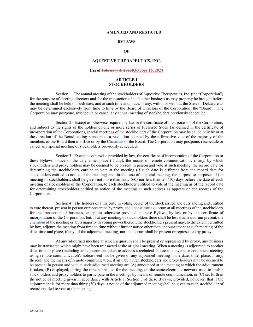 120172535.2 AMENDED AND RESTATED BYLAWS OF AQUESTIVE THERAPEUTICS, INC. [As of February 2, 2023]October 16, 2024 ARTICLE I STOCKHOLDERS Section 1. The annual meeting of the stockholders of Aquestive Therapeutics, Inc. (the “Corporation”) for the purpose of electing directors and for the transaction of such other business as may properly be brought before the meeting shall be held on such date, and at such time and place, if any, within or without the State of Delaware as may be determined exclusively from time to time by the Board of Directors of the Corporation (the “Board”). The Corporation may postpone, reschedule or cancel any annual meeting of stockholders previously scheduled. Section 2. Except as otherwise required by law or the certificate of incorporation of the Corporation, and subject to the rights of the holders of one or more series of Preferred Stock (as defined in the certificate of incorporation of the Corporation), special meetings of the stockholders of the Corporation may be called only by or at the direction of the Board, acting pursuant to a resolution adopted by the affirmative vote of the majority of the members of the Board then in office or by the Chairman of the Board. The Corporation may postpone, reschedule or cancel any special meeting of stockholders previously scheduled. Section 3. Except as otherwise provided by law, the certificate of incorporation of the Corporation or these Bylaws, notice of the date, time, place (if any), the means of remote communications, if any, by which stockholders and proxy holders may be deemed to be present in person and vote at such meeting, the record date for determining the stockholders entitled to vote at the meeting (if such date is different from the record date for stockholders entitled to notice of the meeting) and, in the case of a special meeting, the purpose or purposes of the meeting of stockholders, shall be given not more than sixty (60) nor less than ten (10) days before the date of each meeting of stockholders of the Corporation, to each stockholder entitled to vote at the meeting as of the record date for determining stockholders entitled to notice of the meeting at such address as appears on the records of the Corporation. Section 4. The holders of a majority in voting power of the stock issued and outstanding and entitled to vote thereat, present in person or represented by proxy, shall constitute a quorum at all meetings of the stockholders for the transaction of business, except as otherwise provided in these Bylaws, by law or by the certificate of incorporation of the Corporation; but, if at any meeting of stockholders there shall be less than a quorum present, the chairman of the meeting or, by a majority in voting power thereof, the stockholders present may, to the extent permitted by law, adjourn the meeting from time to time without further notice other than announcement at such meeting of the date, time and place, if any, of the adjourned meeting, until a quorum shall be present or represented by proxy. At any adjourned meeting at which a quorum shall be present or represented by proxy, any business may be transacted which might have been transacted at the original meeting. When a meeting is adjourned to another date, time or place (including an adjournment taken to address a technical failure to convene or continue a meeting using remote communication), notice need not be given of any adjourned meeting if the date, time, place, if any, thereof, and the means of remote communication, if any, by which stockholders and proxy holders may be deemed to be present in person and vote at such adjourned meeting are (A) announced at the meeting at which the adjournment is taken, (B) displayed, during the time scheduled for the meeting, on the same electronic network used to enable stockholders and proxy holders to participate in the meetings by means of remote communication, or (C) set forth in the notice of meeting given in accordance with Article I, Section 3 of these Bylaws; provided, however, that if the adjournment is for more than thirty (30) days, a notice of the adjourned meeting shall be given to each stockholder of record entitled to vote at the meeting.