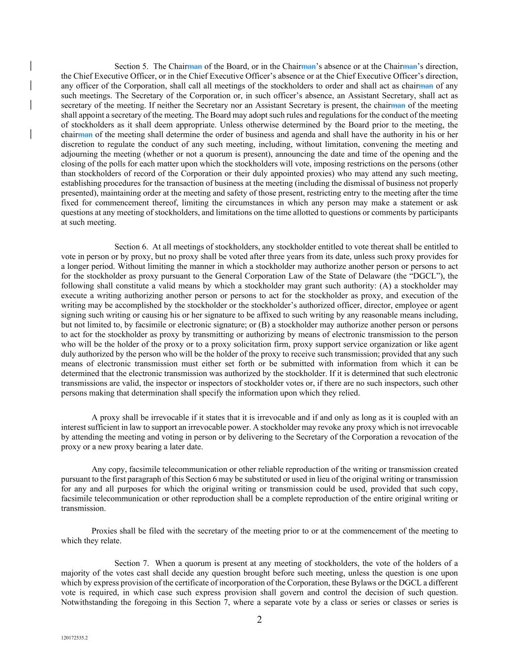 2 120172535.2 Section 5. The Chairman of the Board, or in the Chairman’s absence or at the Chairman’s direction, the Chief Executive Officer, or in the Chief Executive Officer’s absence or at the Chief Executive Officer’s direction, any officer of the Corporation, shall call all meetings of the stockholders to order and shall act as chairman of any such meetings. The Secretary of the Corporation or, in such officer’s absence, an Assistant Secretary, shall act as secretary of the meeting. If neither the Secretary nor an Assistant Secretary is present, the chairman of the meeting shall appoint a secretary of the meeting. The Board may adopt such rules and regulations for the conduct of the meeting of stockholders as it shall deem appropriate. Unless otherwise determined by the Board prior to the meeting, the chairman of the meeting shall determine the order of business and agenda and shall have the authority in his or her discretion to regulate the conduct of any such meeting, including, without limitation, convening the meeting and adjourning the meeting (whether or not a quorum is present), announcing the date and time of the opening and the closing of the polls for each matter upon which the stockholders will vote, imposing restrictions on the persons (other than stockholders of record of the Corporation or their duly appointed proxies) who may attend any such meeting, establishing procedures for the transaction of business at the meeting (including the dismissal of business not properly presented), maintaining order at the meeting and safety of those present, restricting entry to the meeting after the time fixed for commencement thereof, limiting the circumstances in which any person may make a statement or ask questions at any meeting of stockholders, and limitations on the time allotted to questions or comments by participants at such meeting. Section 6. At all meetings of stockholders, any stockholder entitled to vote thereat shall be entitled to vote in person or by proxy, but no proxy shall be voted after three years from its date, unless such proxy provides for a longer period. Without limiting the manner in which a stockholder may authorize another person or persons to act for the stockholder as proxy pursuant to the General Corporation Law of the State of Delaware (the “DGCL”), the following shall constitute a valid means by which a stockholder may grant such authority: (A) a stockholder may execute a writing authorizing another person or persons to act for the stockholder as proxy, and execution of the writing may be accomplished by the stockholder or the stockholder’s authorized officer, director, employee or agent signing such writing or causing his or her signature to be affixed to such writing by any reasonable means including, but not limited to, by facsimile or electronic signature; or (B) a stockholder may authorize another person or persons to act for the stockholder as proxy by transmitting or authorizing by means of electronic transmission to the person who will be the holder of the proxy or to a proxy solicitation firm, proxy support service organization or like agent duly authorized by the person who will be the holder of the proxy to receive such transmission; provided that any such means of electronic transmission must either set forth or be submitted with information from which it can be determined that the electronic transmission was authorized by the stockholder. If it is determined that such electronic transmissions are valid, the inspector or inspectors of stockholder votes or, if there are no such inspectors, such other persons making that determination shall specify the information upon which they relied. A proxy shall be irrevocable if it states that it is irrevocable and if and only as long as it is coupled with an interest sufficient in law to support an irrevocable power. A stockholder may revoke any proxy which is not irrevocable by attending the meeting and voting in person or by delivering to the Secretary of the Corporation a revocation of the proxy or a new proxy bearing a later date. Any copy, facsimile telecommunication or other reliable reproduction of the writing or transmission created pursuant to the first paragraph of this Section 6 may be substituted or used in lieu of the original writing or transmission for any and all purposes for which the original writing or transmission could be used, provided that such copy, facsimile telecommunication or other reproduction shall be a complete reproduction of the entire original writing or transmission. Proxies shall be filed with the secretary of the meeting prior to or at the commencement of the meeting to which they relate. Section 7. When a quorum is present at any meeting of stockholders, the vote of the holders of a majority of the votes cast shall decide any question brought before such meeting, unless the question is one upon which by express provision of the certificate of incorporation of the Corporation, these Bylaws or the DGCL a different vote is required, in which case such express provision shall govern and control the decision of such question. Notwithstanding the foregoing in this Section 7, where a separate vote by a class or series or classes or series is