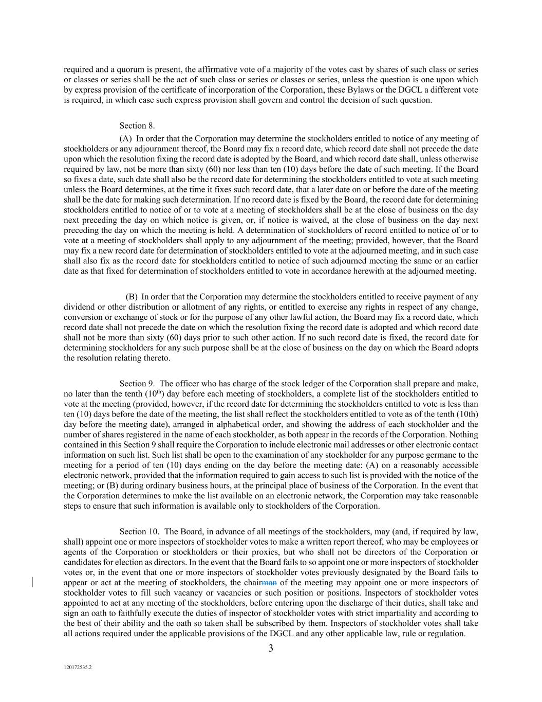 3 120172535.2 required and a quorum is present, the affirmative vote of a majority of the votes cast by shares of such class or series or classes or series shall be the act of such class or series or classes or series, unless the question is one upon which by express provision of the certificate of incorporation of the Corporation, these Bylaws or the DGCL a different vote is required, in which case such express provision shall govern and control the decision of such question. Section 8. (A) In order that the Corporation may determine the stockholders entitled to notice of any meeting of stockholders or any adjournment thereof, the Board may fix a record date, which record date shall not precede the date upon which the resolution fixing the record date is adopted by the Board, and which record date shall, unless otherwise required by law, not be more than sixty (60) nor less than ten (10) days before the date of such meeting. If the Board so fixes a date, such date shall also be the record date for determining the stockholders entitled to vote at such meeting unless the Board determines, at the time it fixes such record date, that a later date on or before the date of the meeting shall be the date for making such determination. If no record date is fixed by the Board, the record date for determining stockholders entitled to notice of or to vote at a meeting of stockholders shall be at the close of business on the day next preceding the day on which notice is given, or, if notice is waived, at the close of business on the day next preceding the day on which the meeting is held. A determination of stockholders of record entitled to notice of or to vote at a meeting of stockholders shall apply to any adjournment of the meeting; provided, however, that the Board may fix a new record date for determination of stockholders entitled to vote at the adjourned meeting, and in such case shall also fix as the record date for stockholders entitled to notice of such adjourned meeting the same or an earlier date as that fixed for determination of stockholders entitled to vote in accordance herewith at the adjourned meeting. (B) In order that the Corporation may determine the stockholders entitled to receive payment of any dividend or other distribution or allotment of any rights, or entitled to exercise any rights in respect of any change, conversion or exchange of stock or for the purpose of any other lawful action, the Board may fix a record date, which record date shall not precede the date on which the resolution fixing the record date is adopted and which record date shall not be more than sixty (60) days prior to such other action. If no such record date is fixed, the record date for determining stockholders for any such purpose shall be at the close of business on the day on which the Board adopts the resolution relating thereto. Section 9. The officer who has charge of the stock ledger of the Corporation shall prepare and make, no later than the tenth (10th) day before each meeting of stockholders, a complete list of the stockholders entitled to vote at the meeting (provided, however, if the record date for determining the stockholders entitled to vote is less than ten (10) days before the date of the meeting, the list shall reflect the stockholders entitled to vote as of the tenth (10th) day before the meeting date), arranged in alphabetical order, and showing the address of each stockholder and the number of shares registered in the name of each stockholder, as both appear in the records of the Corporation. Nothing contained in this Section 9 shall require the Corporation to include electronic mail addresses or other electronic contact information on such list. Such list shall be open to the examination of any stockholder for any purpose germane to the meeting for a period of ten (10) days ending on the day before the meeting date: (A) on a reasonably accessible electronic network, provided that the information required to gain access to such list is provided with the notice of the meeting; or (B) during ordinary business hours, at the principal place of business of the Corporation. In the event that the Corporation determines to make the list available on an electronic network, the Corporation may take reasonable steps to ensure that such information is available only to stockholders of the Corporation. Section 10. The Board, in advance of all meetings of the stockholders, may (and, if required by law, shall) appoint one or more inspectors of stockholder votes to make a written report thereof, who may be employees or agents of the Corporation or stockholders or their proxies, but who shall not be directors of the Corporation or candidates for election as directors. In the event that the Board fails to so appoint one or more inspectors of stockholder votes or, in the event that one or more inspectors of stockholder votes previously designated by the Board fails to appear or act at the meeting of stockholders, the chairman of the meeting may appoint one or more inspectors of stockholder votes to fill such vacancy or vacancies or such position or positions. Inspectors of stockholder votes appointed to act at any meeting of the stockholders, before entering upon the discharge of their duties, shall take and sign an oath to faithfully execute the duties of inspector of stockholder votes with strict impartiality and according to the best of their ability and the oath so taken shall be subscribed by them. Inspectors of stockholder votes shall take all actions required under the applicable provisions of the DGCL and any other applicable law, rule or regulation.