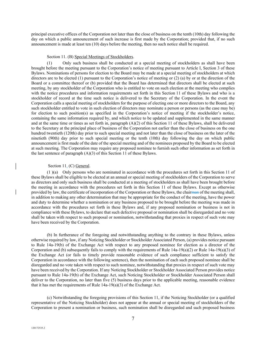 7 120172535.2 principal executive offices of the Corporation not later than the close of business on the tenth (10th) day following the day on which a public announcement of such increase is first made by the Corporation; provided that, if no such announcement is made at least ten (10) days before the meeting, then no such notice shall be required. Section 11. (B) Special Meetings of Stockholders. (1) Only such business shall be conducted at a special meeting of stockholders as shall have been brought before the meeting pursuant to the Corporation’s notice of meeting pursuant to Article I, Section 3 of these Bylaws. Nominations of persons for election to the Board may be made at a special meeting of stockholders at which directors are to be elected (1) pursuant to the Corporation’s notice of meeting or (2) (a) by or at the direction of the Board or a committee thereof or (b) provided that the Board has determined that directors shall be elected at such meeting, by any stockholder of the Corporation who is entitled to vote on such election at the meeting who complies with the notice procedures and information requirements set forth in this Section 11 of these Bylaws and who is a stockholder of record at the time such notice is delivered to the Secretary of the Corporation. In the event the Corporation calls a special meeting of stockholders for the purpose of electing one or more directors to the Board, any such stockholder entitled to vote in such election of directors may nominate a person or persons (as the case may be) for election to such position(s) as specified in the Corporation’s notice of meeting if the stockholder’s notice, containing the same information required by, and which notice to be updated and supplemented in the same manner and at the same time or times as set forth in, paragraph (A)(2) of this Section 11 of these Bylaws, shall be delivered to the Secretary at the principal place of business of the Corporation not earlier than the close of business on the one hundred twentieth (120th) day prior to such special meeting and not later than the close of business on the later of the ninetieth (90th) day prior to such special meeting or the tenth (10th) day following the day on which public announcement is first made of the date of the special meeting and of the nominees proposed by the Board to be elected at such meeting. The Corporation may require any proposed nominee to furnish such other information as set forth in the last sentence of paragraph (A)(3) of this Section 11 of these Bylaws. Section 11. (C) General. (1 )(a) Only persons who are nominated in accordance with the procedures set forth in this Section 11 of these Bylaws shall be eligible to be elected at an annual or special meeting of stockholders of the Corporation to serve as directors and only such business shall be conducted at a meeting of stockholders as shall have been brought before the meeting in accordance with the procedures set forth in this Section 11 of these Bylaws. Except as otherwise provided by law, the certificate of incorporation of the Corporation or these Bylaws, the chairman of the meeting shall, in addition to making any other determination that may be appropriate for the conduct of the meeting, have the power and duty to determine whether a nomination or any business proposed to be brought before the meeting was made in accordance with the procedures set forth in these Bylaws and, if any proposed nomination or business is not in compliance with these Bylaws, to declare that such defective proposal or nomination shall be disregarded and no vote shall be taken with respect to such proposal or nomination, notwithstanding that proxies in respect of such vote may have been received by the Corporation. (b) In furtherance of the foregoing and notwithstanding anything to the contrary in these Bylaws, unless otherwise required by law, if any Noticing Stockholder or Stockholder Associated Person, (a) provides notice pursuant to Rule 14a-19(b) of the Exchange Act with respect to any proposed nominee for election as a director of the Corporation and (b) subsequently fails to comply with the requirements of Rule 14a-19(a)(2) or Rule 14a-19(a)(3) of the Exchange Act (or fails to timely provide reasonable evidence of such compliance sufficient to satisfy the Corporation in accordance with the following sentence), then the nomination of each such proposed nominee shall be disregarded and no vote taken with respect to such nominee, notwithstanding that proxies in respect of such vote may have been received by the Corporation. If any Noticing Stockholder or Stockholder Associated Person provides notice pursuant to Rule 14a-19(b) of the Exchange Act, such Noticing Stockholder or Stockholder Associated Person shall deliver to the Corporation, no later than five (5) business days prior to the applicable meeting, reasonable evidence that it has met the requirements of Rule 14a-19(a)(3) of the Exchange Act. (c) Notwithstanding the foregoing provisions of this Section 11, if the Noticing Stockholder (or a qualified representative of the Noticing Stockholder) does not appear at the annual or special meeting of stockholders of the Corporation to present a nomination or business, such nomination shall be disregarded and such proposed business