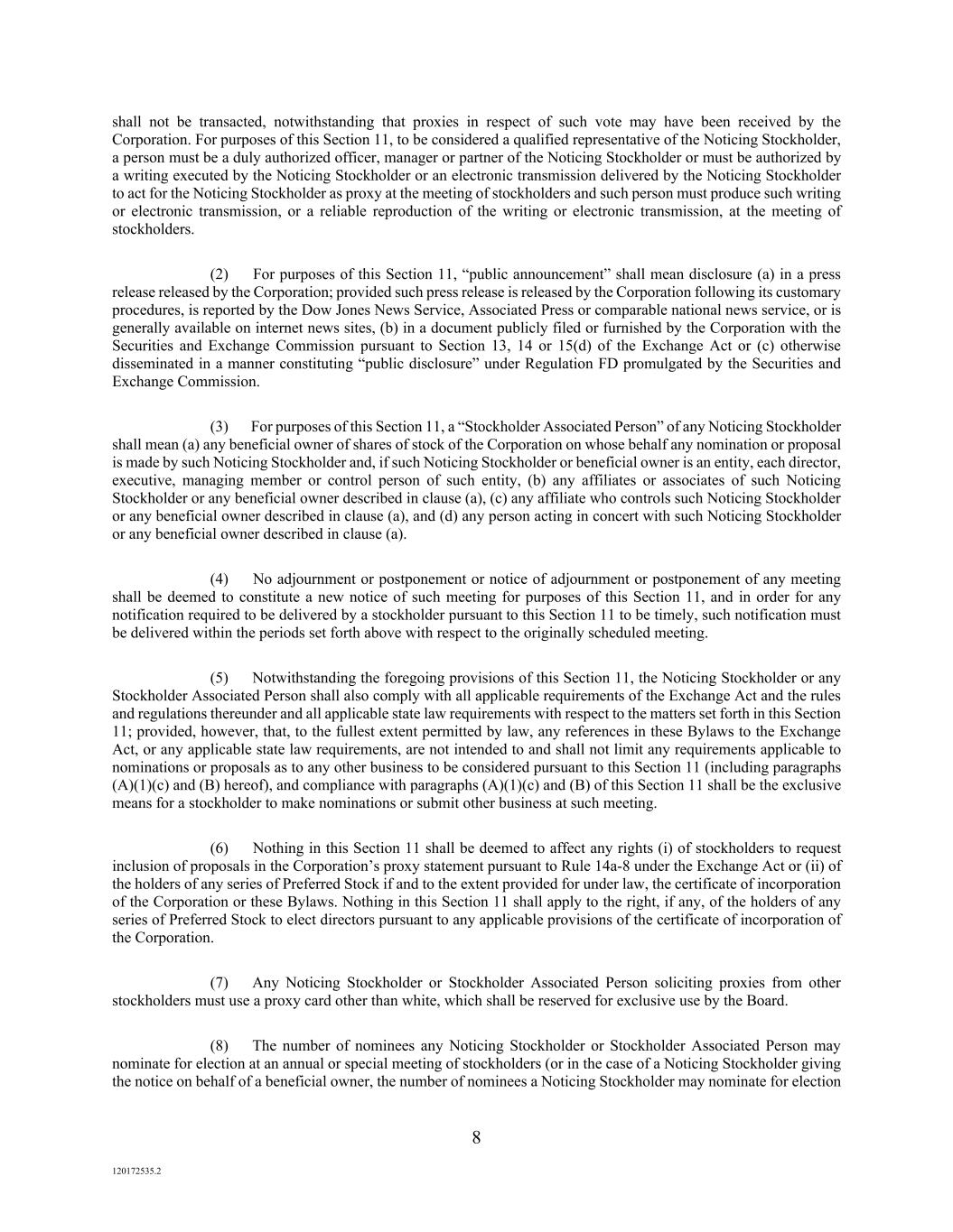 8 120172535.2 shall not be transacted, notwithstanding that proxies in respect of such vote may have been received by the Corporation. For purposes of this Section 11, to be considered a qualified representative of the Noticing Stockholder, a person must be a duly authorized officer, manager or partner of the Noticing Stockholder or must be authorized by a writing executed by the Noticing Stockholder or an electronic transmission delivered by the Noticing Stockholder to act for the Noticing Stockholder as proxy at the meeting of stockholders and such person must produce such writing or electronic transmission, or a reliable reproduction of the writing or electronic transmission, at the meeting of stockholders. (2) For purposes of this Section 11, “public announcement” shall mean disclosure (a) in a press release released by the Corporation; provided such press release is released by the Corporation following its customary procedures, is reported by the Dow Jones News Service, Associated Press or comparable national news service, or is generally available on internet news sites, (b) in a document publicly filed or furnished by the Corporation with the Securities and Exchange Commission pursuant to Section 13, 14 or 15(d) of the Exchange Act or (c) otherwise disseminated in a manner constituting “public disclosure” under Regulation FD promulgated by the Securities and Exchange Commission. (3) For purposes of this Section 11, a “Stockholder Associated Person” of any Noticing Stockholder shall mean (a) any beneficial owner of shares of stock of the Corporation on whose behalf any nomination or proposal is made by such Noticing Stockholder and, if such Noticing Stockholder or beneficial owner is an entity, each director, executive, managing member or control person of such entity, (b) any affiliates or associates of such Noticing Stockholder or any beneficial owner described in clause (a), (c) any affiliate who controls such Noticing Stockholder or any beneficial owner described in clause (a), and (d) any person acting in concert with such Noticing Stockholder or any beneficial owner described in clause (a). (4) No adjournment or postponement or notice of adjournment or postponement of any meeting shall be deemed to constitute a new notice of such meeting for purposes of this Section 11, and in order for any notification required to be delivered by a stockholder pursuant to this Section 11 to be timely, such notification must be delivered within the periods set forth above with respect to the originally scheduled meeting. (5) Notwithstanding the foregoing provisions of this Section 11, the Noticing Stockholder or any Stockholder Associated Person shall also comply with all applicable requirements of the Exchange Act and the rules and regulations thereunder and all applicable state law requirements with respect to the matters set forth in this Section 11; provided, however, that, to the fullest extent permitted by law, any references in these Bylaws to the Exchange Act, or any applicable state law requirements, are not intended to and shall not limit any requirements applicable to nominations or proposals as to any other business to be considered pursuant to this Section 11 (including paragraphs (A)(1)(c) and (B) hereof), and compliance with paragraphs (A)(1)(c) and (B) of this Section 11 shall be the exclusive means for a stockholder to make nominations or submit other business at such meeting. (6) Nothing in this Section 11 shall be deemed to affect any rights (i) of stockholders to request inclusion of proposals in the Corporation’s proxy statement pursuant to Rule 14a-8 under the Exchange Act or (ii) of the holders of any series of Preferred Stock if and to the extent provided for under law, the certificate of incorporation of the Corporation or these Bylaws. Nothing in this Section 11 shall apply to the right, if any, of the holders of any series of Preferred Stock to elect directors pursuant to any applicable provisions of the certificate of incorporation of the Corporation. (7) Any Noticing Stockholder or Stockholder Associated Person soliciting proxies from other stockholders must use a proxy card other than white, which shall be reserved for exclusive use by the Board. (8) The number of nominees any Noticing Stockholder or Stockholder Associated Person may nominate for election at an annual or special meeting of stockholders (or in the case of a Noticing Stockholder giving the notice on behalf of a beneficial owner, the number of nominees a Noticing Stockholder may nominate for election