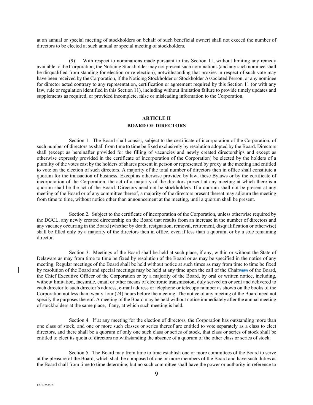 9 120172535.2 at an annual or special meeting of stockholders on behalf of such beneficial owner) shall not exceed the number of directors to be elected at such annual or special meeting of stockholders. (9) With respect to nominations made pursuant to this Section 11, without limiting any remedy available to the Corporation, the Noticing Stockholder may not present such nominations (and any such nominee shall be disqualified from standing for election or re-election), notwithstanding that proxies in respect of such vote may have been received by the Corporation, if the Noticing Stockholder or Stockholder Associated Person, or any nominee for director acted contrary to any representation, certification or agreement required by this Section 11 (or with any law, rule or regulation identified in this Section 11), including without limitation failure to provide timely updates and supplements as required, or provided incomplete, false or misleading information to the Corporation. ARTICLE II BOARD OF DIRECTORS Section 1. The Board shall consist, subject to the certificate of incorporation of the Corporation, of such number of directors as shall from time to time be fixed exclusively by resolution adopted by the Board. Directors shall (except as hereinafter provided for the filling of vacancies and newly created directorships and except as otherwise expressly provided in the certificate of incorporation of the Corporation) be elected by the holders of a plurality of the votes cast by the holders of shares present in person or represented by proxy at the meeting and entitled to vote on the election of such directors. A majority of the total number of directors then in office shall constitute a quorum for the transaction of business. Except as otherwise provided by law, these Bylaws or by the certificate of incorporation of the Corporation, the act of a majority of the directors present at any meeting at which there is a quorum shall be the act of the Board. Directors need not be stockholders. If a quorum shall not be present at any meeting of the Board or of any committee thereof, a majority of the directors present thereat may adjourn the meeting from time to time, without notice other than announcement at the meeting, until a quorum shall be present. Section 2. Subject to the certificate of incorporation of the Corporation, unless otherwise required by the DGCL, any newly created directorship on the Board that results from an increase in the number of directors and any vacancy occurring in the Board (whether by death, resignation, removal, retirement, disqualification or otherwise) shall be filled only by a majority of the directors then in office, even if less than a quorum, or by a sole remaining director. Section 3. Meetings of the Board shall be held at such place, if any, within or without the State of Delaware as may from time to time be fixed by resolution of the Board or as may be specified in the notice of any meeting. Regular meetings of the Board shall be held without notice at such times as may from time to time be fixed by resolution of the Board and special meetings may be held at any time upon the call of the Chairman of the Board, the Chief Executive Officer of the Corporation or by a majority of the Board, by oral or written notice, including, without limitation, facsimile, email or other means of electronic transmission, duly served on or sent and delivered to each director to such director’s address, e-mail address or telephone or telecopy number as shown on the books of the Corporation not less than twenty-four (24) hours before the meeting. The notice of any meeting of the Board need not specify the purposes thereof. A meeting of the Board may be held without notice immediately after the annual meeting of stockholders at the same place, if any, at which such meeting is held. Section 4. If at any meeting for the election of directors, the Corporation has outstanding more than one class of stock, and one or more such classes or series thereof are entitled to vote separately as a class to elect directors, and there shall be a quorum of only one such class or series of stock, that class or series of stock shall be entitled to elect its quota of directors notwithstanding the absence of a quorum of the other class or series of stock. Section 5. The Board may from time to time establish one or more committees of the Board to serve at the pleasure of the Board, which shall be composed of one or more members of the Board and have such duties as the Board shall from time to time determine; but no such committee shall have the power or authority in reference to