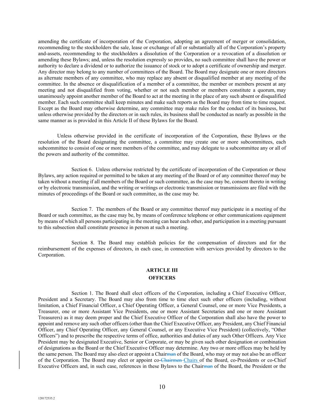 10 120172535.2 amending the certificate of incorporation of the Corporation, adopting an agreement of merger or consolidation, recommending to the stockholders the sale, lease or exchange of all or substantially all of the Corporation’s property and-assets, recommending to the stockholders a dissolution of the Corporation or a revocation of a dissolution or amending these Bylaws; and, unless the resolution expressly so provides, no such committee shall have the power or authority to declare a dividend or to authorize the issuance of stock or to adopt a certificate of ownership and merger. Any director may belong to any number of committees of the Board. The Board may designate one or more directors as alternate members of any committee, who may replace any absent or disqualified member at any meeting of the committee. In the absence or disqualification of a member of a committee, the member or members present at any meeting and not disqualified from voting, whether or not such member or members constitute a quorum, may unanimously appoint another member of the Board to act at the meeting in the place of any such absent or disqualified member. Each such committee shall keep minutes and make such reports as the Board may from time to time request. Except as the Board may otherwise determine, any committee may make rules for the conduct of its business, but unless otherwise provided by the directors or in such rules, its business shall be conducted as nearly as possible in the same manner as is provided in this Article II of these Bylaws for the Board. Unless otherwise provided in the certificate of incorporation of the Corporation, these Bylaws or the resolution of the Board designating the committee, a committee may create one or more subcommittees, each subcommittee to consist of one or more members of the committee, and may delegate to a subcommittee any or all of the powers and authority of the committee. Section 6. Unless otherwise restricted by the certificate of incorporation of the Corporation or these Bylaws, any action required or permitted to be taken at any meeting of the Board or of any committee thereof may be taken without a meeting if all members of the Board or such committee, as the case may be, consent thereto in writing or by electronic transmission, and the writing or writings or electronic transmission or transmissions are filed with the minutes of proceedings of the Board or such committee, as the case may be. Section 7. The members of the Board or any committee thereof may participate in a meeting of the Board or such committee, as the case may be, by means of conference telephone or other communications equipment by means of which all persons participating in the meeting can hear each other, and participation in a meeting pursuant to this subsection shall constitute presence in person at such a meeting. Section 8. The Board may establish policies for the compensation of directors and for the reimbursement of the expenses of directors, in each case, in connection with services provided by directors to the Corporation. ARTICLE III OFFICERS Section 1. The Board shall elect officers of the Corporation, including a Chief Executive Officer, President and a Secretary. The Board may also from time to time elect such other officers (including, without limitation, a Chief Financial Officer, a Chief Operating Officer, a General Counsel, one or more Vice Presidents, a Treasurer, one or more Assistant Vice Presidents, one or more Assistant Secretaries and one or more Assistant Treasurers) as it may deem proper and the Chief Executive Officer of the Corporation shall also have the power to appoint and remove any such other officers (other than the Chief Executive Officer, any President, any Chief Financial Officer, any Chief Operating Officer, any General Counsel, or any Executive Vice President) (collectively, “Other Officers”) and to prescribe the respective terms of office, authorities and duties of any such Other Officers. Any Vice President may be designated Executive, Senior or Corporate, or may be given such other designation or combination of designations as the Board or the Chief Executive Officer may determine. Any two or more offices may be held by the same person. The Board may also elect or appoint a Chairman of the Board, who may or may not also be an officer of the Corporation. The Board may elect or appoint co-Chairmen Chairs of the Board, co-Presidents or co-Chief Executive Officers and, in such case, references in these Bylaws to the Chairman of the Board, the President or the