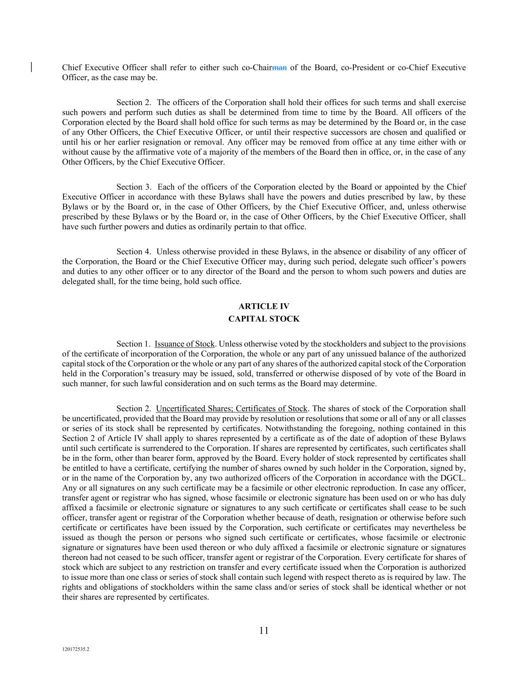 11 120172535.2 Chief Executive Officer shall refer to either such co-Chairman of the Board, co-President or co-Chief Executive Officer, as the case may be. Section 2. The officers of the Corporation shall hold their offices for such terms and shall exercise such powers and perform such duties as shall be determined from time to time by the Board. All officers of the Corporation elected by the Board shall hold office for such terms as may be determined by the Board or, in the case of any Other Officers, the Chief Executive Officer, or until their respective successors are chosen and qualified or until his or her earlier resignation or removal. Any officer may be removed from office at any time either with or without cause by the affirmative vote of a majority of the members of the Board then in office, or, in the case of any Other Officers, by the Chief Executive Officer. Section 3. Each of the officers of the Corporation elected by the Board or appointed by the Chief Executive Officer in accordance with these Bylaws shall have the powers and duties prescribed by law, by these Bylaws or by the Board or, in the case of Other Officers, by the Chief Executive Officer, and, unless otherwise prescribed by these Bylaws or by the Board or, in the case of Other Officers, by the Chief Executive Officer, shall have such further powers and duties as ordinarily pertain to that office. Section 4. Unless otherwise provided in these Bylaws, in the absence or disability of any officer of the Corporation, the Board or the Chief Executive Officer may, during such period, delegate such officer’s powers and duties to any other officer or to any director of the Board and the person to whom such powers and duties are delegated shall, for the time being, hold such office. ARTICLE IV CAPITAL STOCK Section 1. Issuance of Stock. Unless otherwise voted by the stockholders and subject to the provisions of the certificate of incorporation of the Corporation, the whole or any part of any unissued balance of the authorized capital stock of the Corporation or the whole or any part of any shares of the authorized capital stock of the Corporation held in the Corporation’s treasury may be issued, sold, transferred or otherwise disposed of by vote of the Board in such manner, for such lawful consideration and on such terms as the Board may determine. Section 2. Uncertificated Shares; Certificates of Stock. The shares of stock of the Corporation shall be uncertificated, provided that the Board may provide by resolution or resolutions that some or all of any or all classes or series of its stock shall be represented by certificates. Notwithstanding the foregoing, nothing contained in this Section 2 of Article IV shall apply to shares represented by a certificate as of the date of adoption of these Bylaws until such certificate is surrendered to the Corporation. If shares are represented by certificates, such certificates shall be in the form, other than bearer form, approved by the Board. Every holder of stock represented by certificates shall be entitled to have a certificate, certifying the number of shares owned by such holder in the Corporation, signed by, or in the name of the Corporation by, any two authorized officers of the Corporation in accordance with the DGCL. Any or all signatures on any such certificate may be a facsimile or other electronic reproduction. In case any officer, transfer agent or registrar who has signed, whose facsimile or electronic signature has been used on or who has duly affixed a facsimile or electronic signature or signatures to any such certificate or certificates shall cease to be such officer, transfer agent or registrar of the Corporation whether because of death, resignation or otherwise before such certificate or certificates have been issued by the Corporation, such certificate or certificates may nevertheless be issued as though the person or persons who signed such certificate or certificates, whose facsimile or electronic signature or signatures have been used thereon or who duly affixed a facsimile or electronic signature or signatures thereon had not ceased to be such officer, transfer agent or registrar of the Corporation. Every certificate for shares of stock which are subject to any restriction on transfer and every certificate issued when the Corporation is authorized to issue more than one class or series of stock shall contain such legend with respect thereto as is required by law. The rights and obligations of stockholders within the same class and/or series of stock shall be identical whether or not their shares are represented by certificates.