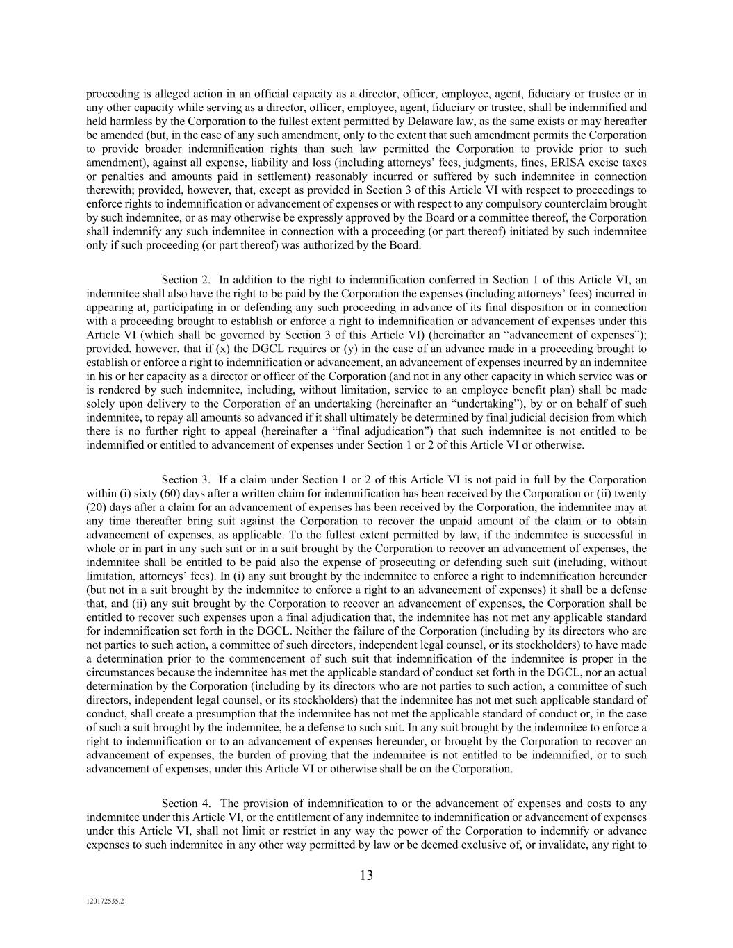 13 120172535.2 proceeding is alleged action in an official capacity as a director, officer, employee, agent, fiduciary or trustee or in any other capacity while serving as a director, officer, employee, agent, fiduciary or trustee, shall be indemnified and held harmless by the Corporation to the fullest extent permitted by Delaware law, as the same exists or may hereafter be amended (but, in the case of any such amendment, only to the extent that such amendment permits the Corporation to provide broader indemnification rights than such law permitted the Corporation to provide prior to such amendment), against all expense, liability and loss (including attorneys’ fees, judgments, fines, ERISA excise taxes or penalties and amounts paid in settlement) reasonably incurred or suffered by such indemnitee in connection therewith; provided, however, that, except as provided in Section 3 of this Article VI with respect to proceedings to enforce rights to indemnification or advancement of expenses or with respect to any compulsory counterclaim brought by such indemnitee, or as may otherwise be expressly approved by the Board or a committee thereof, the Corporation shall indemnify any such indemnitee in connection with a proceeding (or part thereof) initiated by such indemnitee only if such proceeding (or part thereof) was authorized by the Board. Section 2. In addition to the right to indemnification conferred in Section 1 of this Article VI, an indemnitee shall also have the right to be paid by the Corporation the expenses (including attorneys’ fees) incurred in appearing at, participating in or defending any such proceeding in advance of its final disposition or in connection with a proceeding brought to establish or enforce a right to indemnification or advancement of expenses under this Article VI (which shall be governed by Section 3 of this Article VI) (hereinafter an “advancement of expenses”); provided, however, that if (x) the DGCL requires or (y) in the case of an advance made in a proceeding brought to establish or enforce a right to indemnification or advancement, an advancement of expenses incurred by an indemnitee in his or her capacity as a director or officer of the Corporation (and not in any other capacity in which service was or is rendered by such indemnitee, including, without limitation, service to an employee benefit plan) shall be made solely upon delivery to the Corporation of an undertaking (hereinafter an “undertaking”), by or on behalf of such indemnitee, to repay all amounts so advanced if it shall ultimately be determined by final judicial decision from which there is no further right to appeal (hereinafter a “final adjudication”) that such indemnitee is not entitled to be indemnified or entitled to advancement of expenses under Section 1 or 2 of this Article VI or otherwise. Section 3. If a claim under Section 1 or 2 of this Article VI is not paid in full by the Corporation within (i) sixty (60) days after a written claim for indemnification has been received by the Corporation or (ii) twenty (20) days after a claim for an advancement of expenses has been received by the Corporation, the indemnitee may at any time thereafter bring suit against the Corporation to recover the unpaid amount of the claim or to obtain advancement of expenses, as applicable. To the fullest extent permitted by law, if the indemnitee is successful in whole or in part in any such suit or in a suit brought by the Corporation to recover an advancement of expenses, the indemnitee shall be entitled to be paid also the expense of prosecuting or defending such suit (including, without limitation, attorneys’ fees). In (i) any suit brought by the indemnitee to enforce a right to indemnification hereunder (but not in a suit brought by the indemnitee to enforce a right to an advancement of expenses) it shall be a defense that, and (ii) any suit brought by the Corporation to recover an advancement of expenses, the Corporation shall be entitled to recover such expenses upon a final adjudication that, the indemnitee has not met any applicable standard for indemnification set forth in the DGCL. Neither the failure of the Corporation (including by its directors who are not parties to such action, a committee of such directors, independent legal counsel, or its stockholders) to have made a determination prior to the commencement of such suit that indemnification of the indemnitee is proper in the circumstances because the indemnitee has met the applicable standard of conduct set forth in the DGCL, nor an actual determination by the Corporation (including by its directors who are not parties to such action, a committee of such directors, independent legal counsel, or its stockholders) that the indemnitee has not met such applicable standard of conduct, shall create a presumption that the indemnitee has not met the applicable standard of conduct or, in the case of such a suit brought by the indemnitee, be a defense to such suit. In any suit brought by the indemnitee to enforce a right to indemnification or to an advancement of expenses hereunder, or brought by the Corporation to recover an advancement of expenses, the burden of proving that the indemnitee is not entitled to be indemnified, or to such advancement of expenses, under this Article VI or otherwise shall be on the Corporation. Section 4. The provision of indemnification to or the advancement of expenses and costs to any indemnitee under this Article VI, or the entitlement of any indemnitee to indemnification or advancement of expenses under this Article VI, shall not limit or restrict in any way the power of the Corporation to indemnify or advance expenses to such indemnitee in any other way permitted by law or be deemed exclusive of, or invalidate, any right to