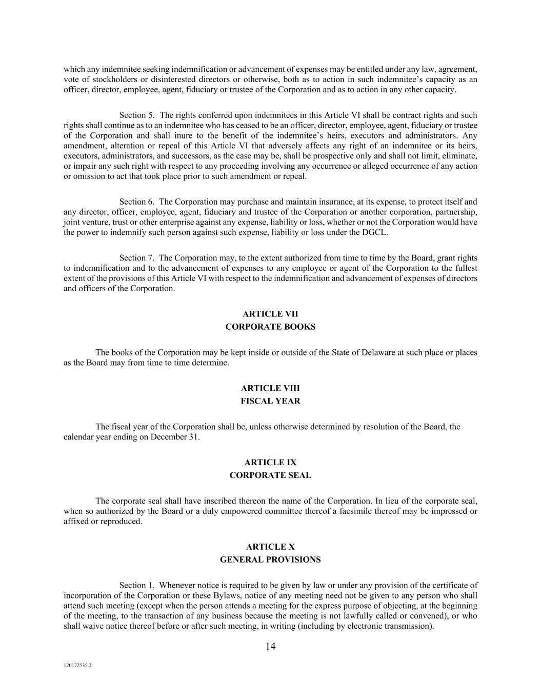 14 120172535.2 which any indemnitee seeking indemnification or advancement of expenses may be entitled under any law, agreement, vote of stockholders or disinterested directors or otherwise, both as to action in such indemnitee’s capacity as an officer, director, employee, agent, fiduciary or trustee of the Corporation and as to action in any other capacity. Section 5. The rights conferred upon indemnitees in this Article VI shall be contract rights and such rights shall continue as to an indemnitee who has ceased to be an officer, director, employee, agent, fiduciary or trustee of the Corporation and shall inure to the benefit of the indemnitee’s heirs, executors and administrators. Any amendment, alteration or repeal of this Article VI that adversely affects any right of an indemnitee or its heirs, executors, administrators, and successors, as the case may be, shall be prospective only and shall not limit, eliminate, or impair any such right with respect to any proceeding involving any occurrence or alleged occurrence of any action or omission to act that took place prior to such amendment or repeal. Section 6. The Corporation may purchase and maintain insurance, at its expense, to protect itself and any director, officer, employee, agent, fiduciary and trustee of the Corporation or another corporation, partnership, joint venture, trust or other enterprise against any expense, liability or loss, whether or not the Corporation would have the power to indemnify such person against such expense, liability or loss under the DGCL. Section 7. The Corporation may, to the extent authorized from time to time by the Board, grant rights to indemnification and to the advancement of expenses to any employee or agent of the Corporation to the fullest extent of the provisions of this Article VI with respect to the indemnification and advancement of expenses of directors and officers of the Corporation. ARTICLE VII CORPORATE BOOKS The books of the Corporation may be kept inside or outside of the State of Delaware at such place or places as the Board may from time to time determine. ARTICLE VIII FISCAL YEAR The fiscal year of the Corporation shall be, unless otherwise determined by resolution of the Board, the calendar year ending on December 31. ARTICLE IX CORPORATE SEAL The corporate seal shall have inscribed thereon the name of the Corporation. In lieu of the corporate seal, when so authorized by the Board or a duly empowered committee thereof a facsimile thereof may be impressed or affixed or reproduced. ARTICLE X GENERAL PROVISIONS Section 1. Whenever notice is required to be given by law or under any provision of the certificate of incorporation of the Corporation or these Bylaws, notice of any meeting need not be given to any person who shall attend such meeting (except when the person attends a meeting for the express purpose of objecting, at the beginning of the meeting, to the transaction of any business because the meeting is not lawfully called or convened), or who shall waive notice thereof before or after such meeting, in writing (including by electronic transmission).