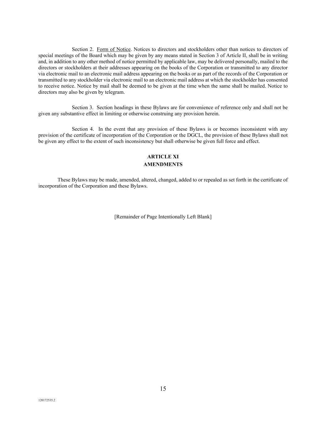 15 120172535.2 Section 2. Form of Notice. Notices to directors and stockholders other than notices to directors of special meetings of the Board which may be given by any means stated in Section 3 of Article II, shall be in writing and, in addition to any other method of notice permitted by applicable law, may be delivered personally, mailed to the directors or stockholders at their addresses appearing on the books of the Corporation or transmitted to any director via electronic mail to an electronic mail address appearing on the books or as part of the records of the Corporation or transmitted to any stockholder via electronic mail to an electronic mail address at which the stockholder has consented to receive notice. Notice by mail shall be deemed to be given at the time when the same shall be mailed. Notice to directors may also be given by telegram. Section 3. Section headings in these Bylaws are for convenience of reference only and shall not be given any substantive effect in limiting or otherwise construing any provision herein. Section 4. In the event that any provision of these Bylaws is or becomes inconsistent with any provision of the certificate of incorporation of the Corporation or the DGCL, the provision of these Bylaws shall not be given any effect to the extent of such inconsistency but shall otherwise be given full force and effect. ARTICLE XI AMENDMENTS These Bylaws may be made, amended, altered, changed, added to or repealed as set forth in the certificate of incorporation of the Corporation and these Bylaws. [Remainder of Page Intentionally Left Blank]