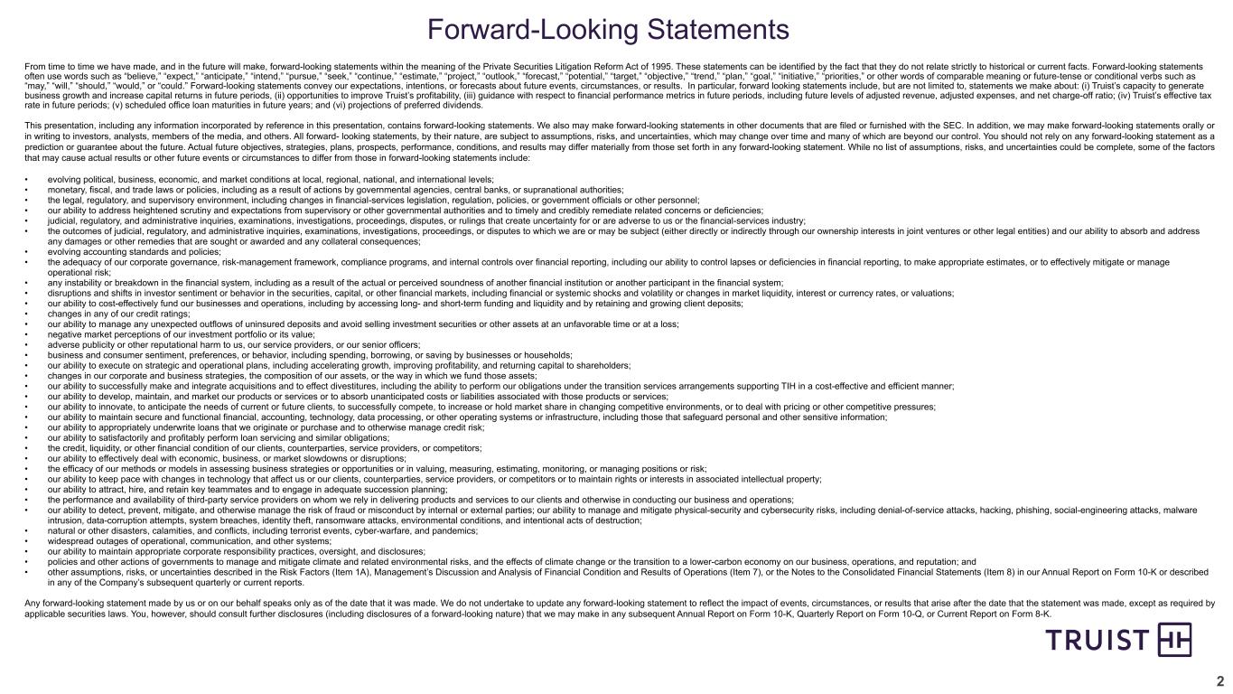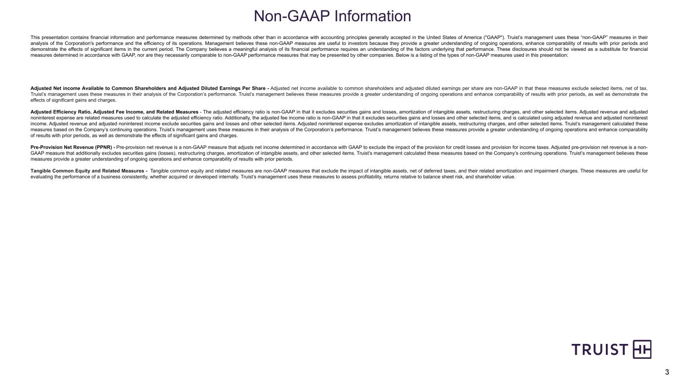 2 From time to time we have made, and in the future will make, forward-looking statements within the meaning of the Private Securities Litigation Reform Act of 1995. These statements can be identified by the fact that they do not relate strictly to historical or current facts. Forward-looking statements often use words such as “believe,” “expect,” “anticipate,” “intend,” “pursue,” “seek,” “continue,” “estimate,” “project,” “outlook,” “forecast,” “potential,” “target,” “objective,” “trend,” “plan,” “goal,” “initiative,” “priorities,” or other words of comparable meaning or future-tense or conditional verbs such as “may,” “will,” “should,” “would,” or “could.” Forward-looking statements convey our expectations, intentions, or forecasts about future events, circumstances, or results. In particular, forward looking statements include, but are not limited to, statements we make about: (i) Truist’s capacity to generate business growth and increase capital returns in future periods, (ii) opportunities to improve Truist’s profitability, (iii) guidance with respect to financial performance metrics in future periods, including future levels of adjusted revenue, adjusted expenses, and net charge-off ratio; (iv) Truist’s effective tax rate in future periods; (v) scheduled office loan maturities in future years; and (vi) projections of preferred dividends. This presentation, including any information incorporated by reference in this presentation, contains forward-looking statements. We also may make forward-looking statements in other documents that are filed or furnished with the SEC. In addition, we may make forward-looking statements orally or in writing to investors, analysts, members of the media, and others. All forward- looking statements, by their nature, are subject to assumptions, risks, and uncertainties, which may change over time and many of which are beyond our control. You should not rely on any forward-looking statement as a prediction or guarantee about the future. Actual future objectives, strategies, plans, prospects, performance, conditions, and results may differ materially from those set forth in any forward-looking statement. While no list of assumptions, risks, and uncertainties could be complete, some of the factors that may cause actual results or other future events or circumstances to differ from those in forward-looking statements include: • evolving political, business, economic, and market conditions at local, regional, national, and international levels; • monetary, fiscal, and trade laws or policies, including as a result of actions by governmental agencies, central banks, or supranational authorities; • the legal, regulatory, and supervisory environment, including changes in financial-services legislation, regulation, policies, or government officials or other personnel; • our ability to address heightened scrutiny and expectations from supervisory or other governmental authorities and to timely and credibly remediate related concerns or deficiencies; • judicial, regulatory, and administrative inquiries, examinations, investigations, proceedings, disputes, or rulings that create uncertainty for or are adverse to us or the financial-services industry; • the outcomes of judicial, regulatory, and administrative inquiries, examinations, investigations, proceedings, or disputes to which we are or may be subject (either directly or indirectly through our ownership interests in joint ventures or other legal entities) and our ability to absorb and address any damages or other remedies that are sought or awarded and any collateral consequences; • evolving accounting standards and policies; • the adequacy of our corporate governance, risk-management framework, compliance programs, and internal controls over financial reporting, including our ability to control lapses or deficiencies in financial reporting, to make appropriate estimates, or to effectively mitigate or manage operational risk; • any instability or breakdown in the financial system, including as a result of the actual or perceived soundness of another financial institution or another participant in the financial system; • disruptions and shifts in investor sentiment or behavior in the securities, capital, or other financial markets, including financial or systemic shocks and volatility or changes in market liquidity, interest or currency rates, or valuations; • our ability to cost-effectively fund our businesses and operations, including by accessing long- and short-term funding and liquidity and by retaining and growing client deposits; • changes in any of our credit ratings; • our ability to manage any unexpected outflows of uninsured deposits and avoid selling investment securities or other assets at an unfavorable time or at a loss; • negative market perceptions of our investment portfolio or its value; • adverse publicity or other reputational harm to us, our service providers, or our senior officers; • business and consumer sentiment, preferences, or behavior, including spending, borrowing, or saving by businesses or households; • our ability to execute on strategic and operational plans, including accelerating growth, improving profitability, and returning capital to shareholders; • changes in our corporate and business strategies, the composition of our assets, or the way in which we fund those assets; • our ability to successfully make and integrate acquisitions and to effect divestitures, including the ability to perform our obligations under the transition services arrangements supporting TIH in a cost-effective and efficient manner; • our ability to develop, maintain, and market our products or services or to absorb unanticipated costs or liabilities associated with those products or services; • our ability to innovate, to anticipate the needs of current or fu