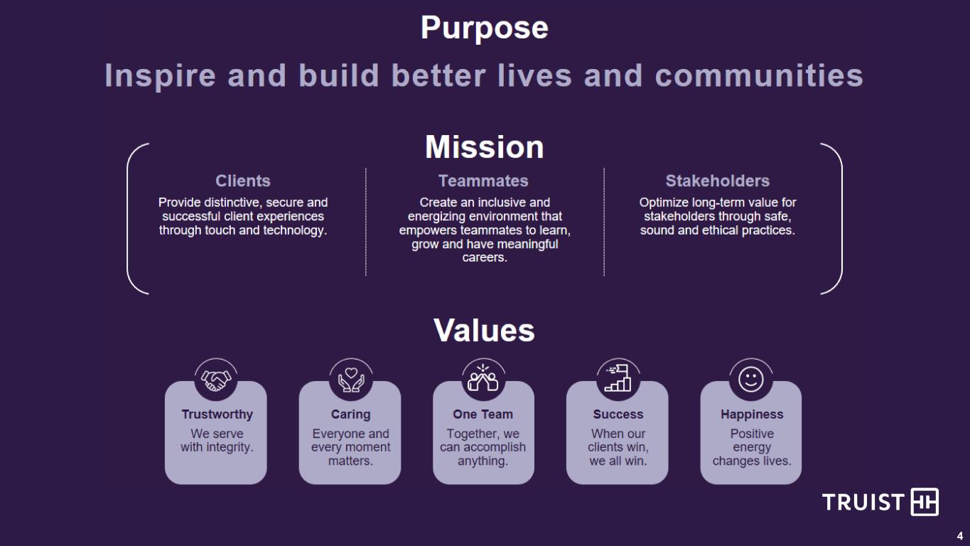 3 Non-GAAP Information This presentation contains financial information and performance measures determined by methods other than in accordance with accounting principles generally accepted in the United States of America ("GAAP"). Truist’s management uses these “non-GAAP” measures in their analysis of the Corporation's performance and the efficiency of its operations. Management believes these non-GAAP measures are useful to investors because they provide a greater understanding of ongoing operations, enhance comparability of results with prior periods and demonstrate the effects of significant items in the current period. The Company believes a meaningful analysis of its financial performance requires an understanding of the factors underlying that performance. These disclosures should not be viewed as a substitute for financial measures determined in accordance with GAAP, nor are they necessarily comparable to non-GAAP performance measures that may be presented by other companies. Below is a listing of the types of non-GAAP measures used in this presentation: Adjusted Net income Available to Common Shareholders and Adjusted Diluted Earnings Per Share - Adjusted net income available to common shareholders and adjusted diluted earnings per share are non-GAAP in that these measures exclude selected items, net of tax. Truist’s management uses these measures in their analysis of the Corporation’s performance. Truist’s management believes these measures provide a greater understanding of ongoing operations and enhance comparability of results with prior periods, as well as demonstrate the effects of significant gains and charges. Adjusted Efficiency Ratio, Adjusted Fee Income, and Related Measures - The adjusted efficiency ratio is non-GAAP in that it excludes securities gains and losses, amortization of intangible assets, restructuring charges, and other selected items. Adjusted revenue and adjusted noninterest expense are related measures used to calculate the adjusted efficiency ratio. Additionally, the adjusted fee income ratio is non-GAAP in that it excludes securities gains and losses and other selected items, and is calculated using adjusted revenue and adjusted noninterest income. Adjusted revenue and adjusted noninterest income exclude securities gains and losses and other selected items. Adjusted noninterest expense excludes amortization of intangible assets, restructuring charges, and other selected items. Truist’s management calculated these measures based on the Company’s continuing operations. Truist’s management uses these measures in their analysis of the Corporation’s performance. Truist’s management believes these measures provide a greater understanding of ongoing operations and enhance comparability of results with prior periods, as well as demonstrate the effects of significant gains and charges. Pre-Provision Net Revenue (PPNR) - Pre-provision net revenue is a non-GAAP measure that adjusts net income determined in accordance with GAAP to exclude the impact of the provision for credit losses and provision for income taxes. Adjusted pre-provision net revenue is a non- GAAP measure that additionally excludes securities gains (losses), restructuring charges, amortization of intangible assets, and other selected items. Truist’s management calculated these measures based on the Company’s continuing operations. Truist’s management believes these measures provide a greater understanding of ongoing operations and enhance comparability of results with prior periods. Tangible Common Equity and Related Measures - Tangible common equity and related measures are non-GAAP measures that exclude the impact of intangible assets, net of deferred taxes, and their related amortization and impairment charges. These measures are useful for evaluating the performance of a business consistently, whether acquired or developed internally. Truist’s management uses these measures to assess profitability, returns relative to balance sheet risk, and shareholder value.