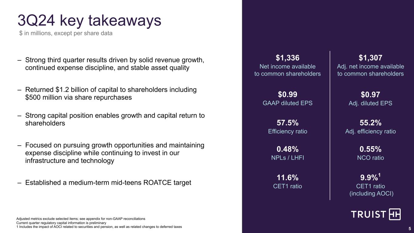 Net income available to common shareholders of $1.3 billion, or $0.99 per share | Solid third quarter results driven by strong revenue growth, expense discipline, and stable asset quality | Repurchased $500 million in common shares; Dividend and total payout ratios of 52% and 90% |